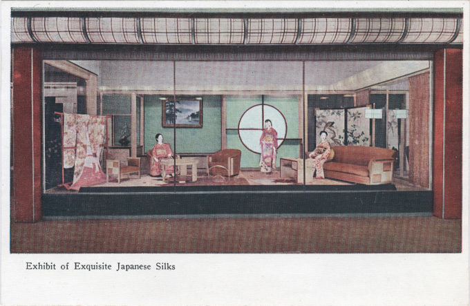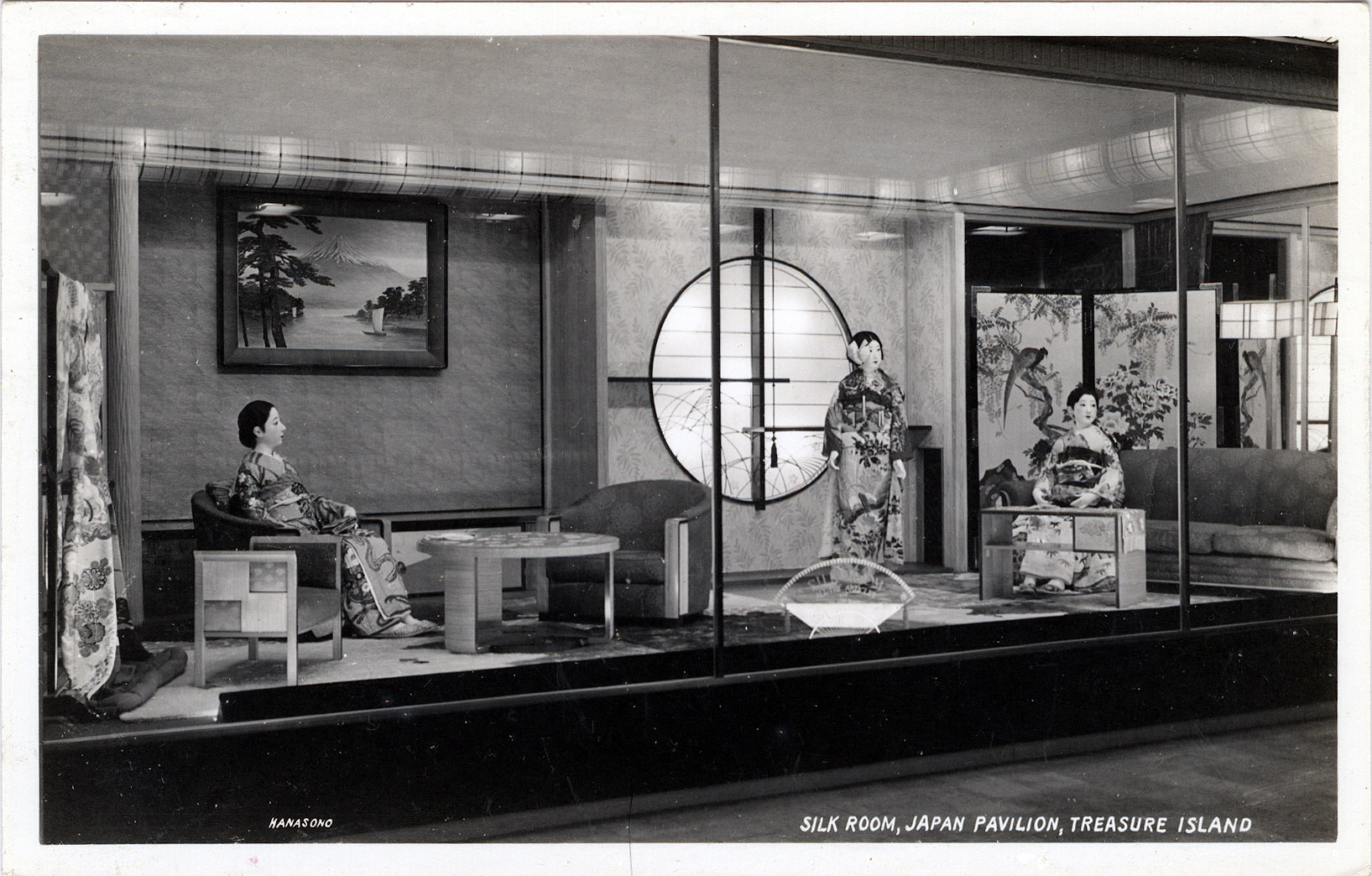 - “Exhibit of exquisite Japanese silks”. Japan Pavilion, Golden Gate International Exposition, San Francisco, CA, 1939.