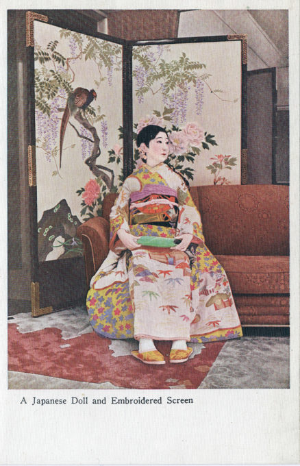 - “A Japanese doll and embroidered screen.”Japan Pavilion, Golden Gate International Exposition, San Francisco, CA, 1939.
