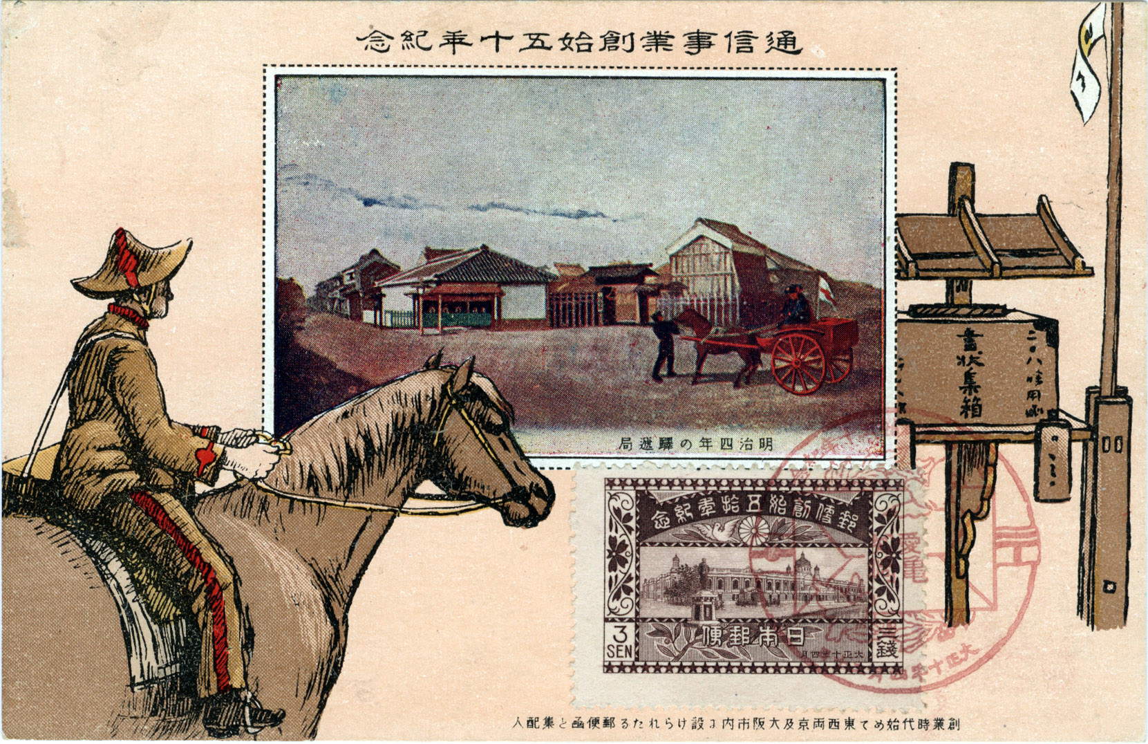 Postcard commemorating the 50th Anniversary of the Japan Postal Service, 1921, depicting a feudal-era post rider on horseback; inset illustrates the Meiji-era use of horse-drawn wagons for bulk postal transport.