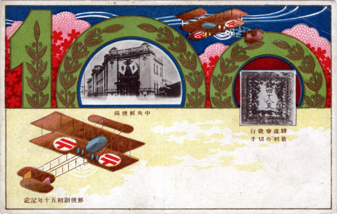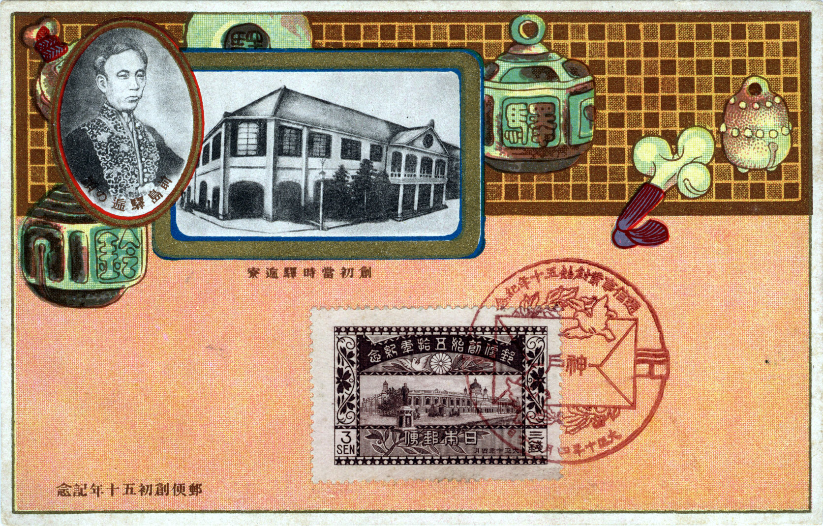 Commemorative postcard of the 50th anniversary of Postal Service, 1921. Inset photos include Baron Maejima Hisoka, who proposed the creation of Japan’s postal system in 1871 (and earlier had proposed moving the capital from Kyoto to Edo), coined the Japanese word for postage stamp (kitte), and created the postal savings system; and the first Communications Bureau.