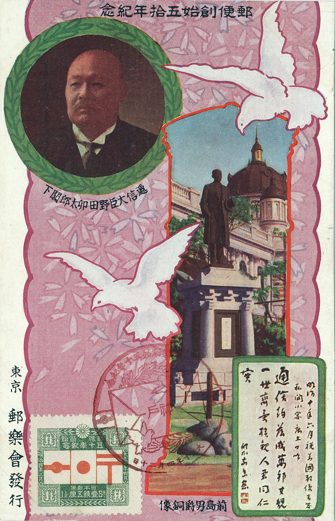 50th Postal Anniversary commemorative postcard, 1921. Illustration inset at upper-left is of Noda Utaro, Minister of Communications from 1918-1922. He was elected to the Lower House of the Diet of Japan in the March 1898 General Election, and was subsequently re-elected a total of nine times. As an entrepreneur, he was one of the founding members of the South Manchurian Railway in 1906. To the right, the statue of Baron Maejima Hisoka outside the Ministry of Communications. It was he who proposed the creation of Japan’s postal system in 1871 (and as he had earlier proposed moving the capital from Kyoto to Edo), who coined the Japanese word for postage stamp (kitte), and who created the postal savings system, and the became first Communications Bureau minister.