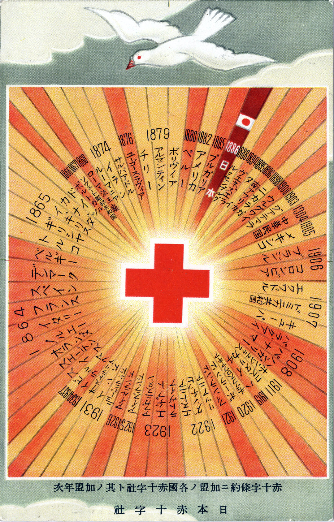 Commemorative postcard of International Red Cross Societies membership roll, 1937. The Japan Red Cross Society joined in 1886. The founding nations, in 1864, were Switzerland, Sweden, Holland, Norway, Italy, France, Spain, Denmark, and Belgium. The United States joined in 1882.
