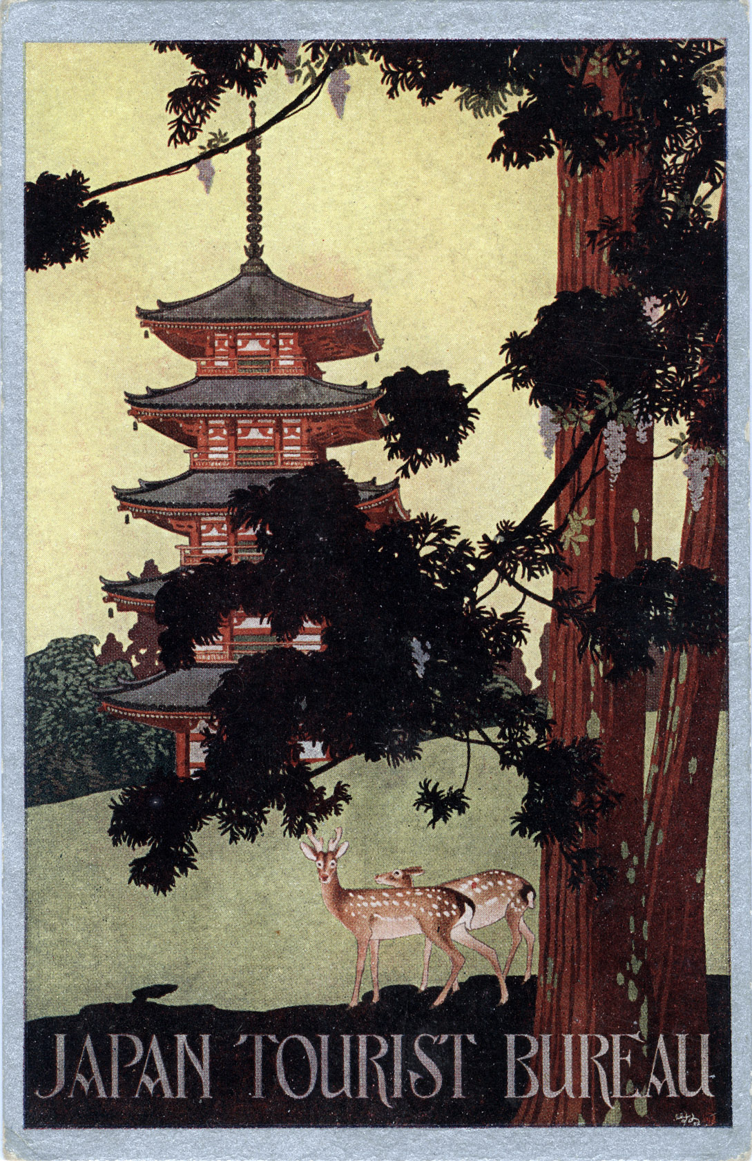 Japan Tourist Bureau advertising postcard, c. 1920, featuring Nara Park in the ancient capital of Nara.