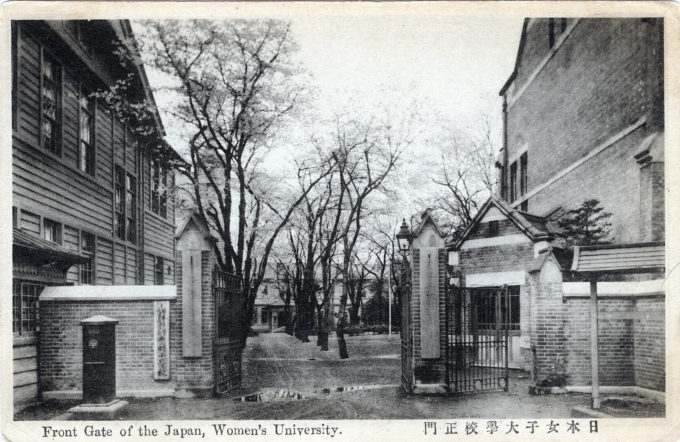 “Front gate of the Japan Women’s University”, Meijiro, Tokyo, c. 1920. Japan Women’s University [Nihon joshi daigaku] was founded by education reformist Jinzo Naruse in 1901. The school enjoyed the stalwart support of two leading benefactors: Eiichi Shibusawa, a Meiji era businessman called “the father of Japanese capitalism”, and Asako Hirooka, one of Japan’s earliest businesswomen and bankers (who was also the model of the main character of the NHK-TV series Asa ga Kita).
