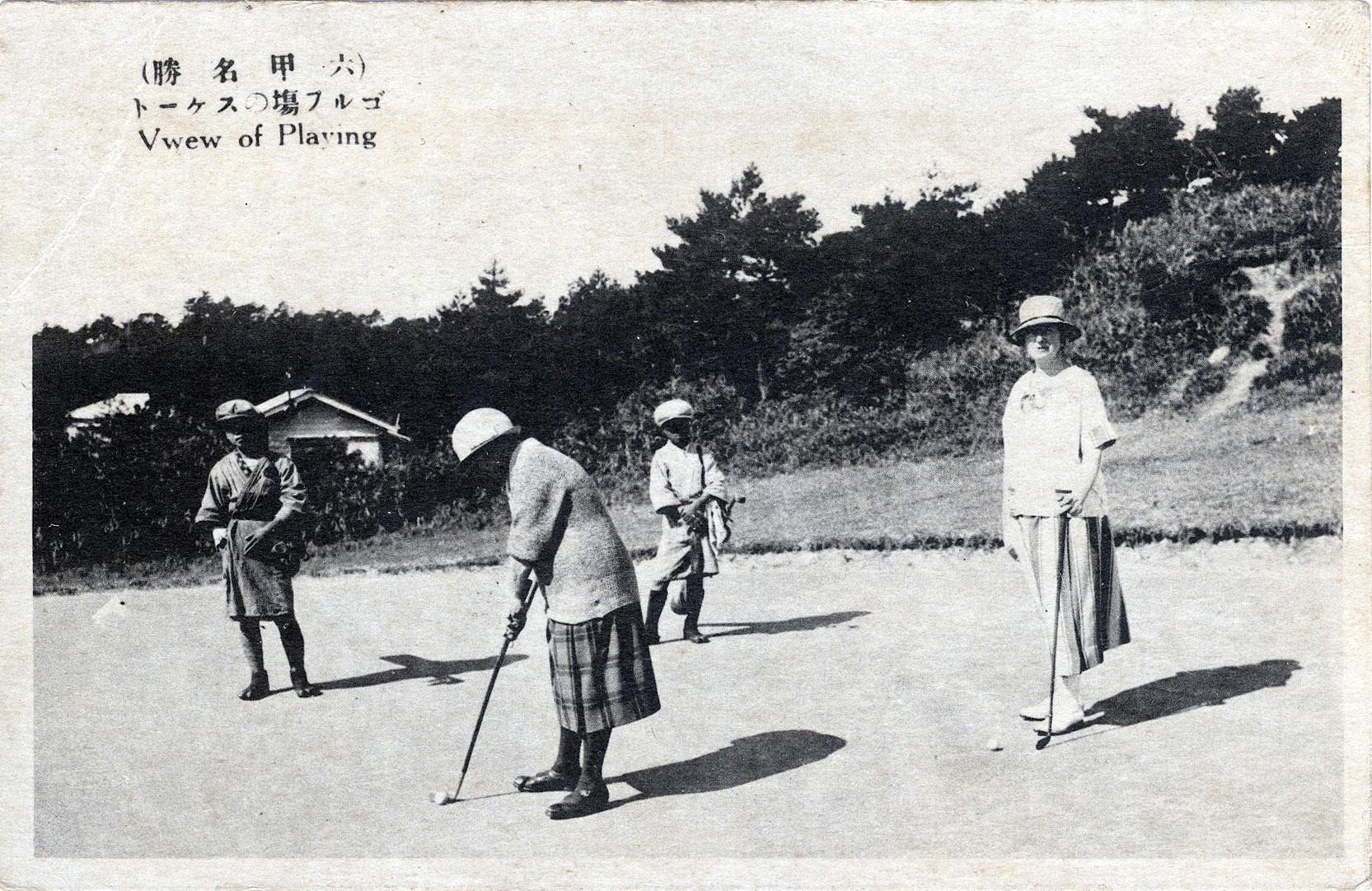 Rokko-san golf course, Kobe, c. 1920. Originally opened with nine-holes in May 1903, the very first golf course in Japan, the Mt. Rokko golf course would quickly expand to a full par 61 eighteen-holes in 1904. The course lives on today as the Kobe Golf Club. As the course was literally carved out of a mountain, it can be quite demanding. Strict rules are still enforced to maintain the course’s pristine condition such as a prohibition of golf carts and a limit of ten clubs per player.