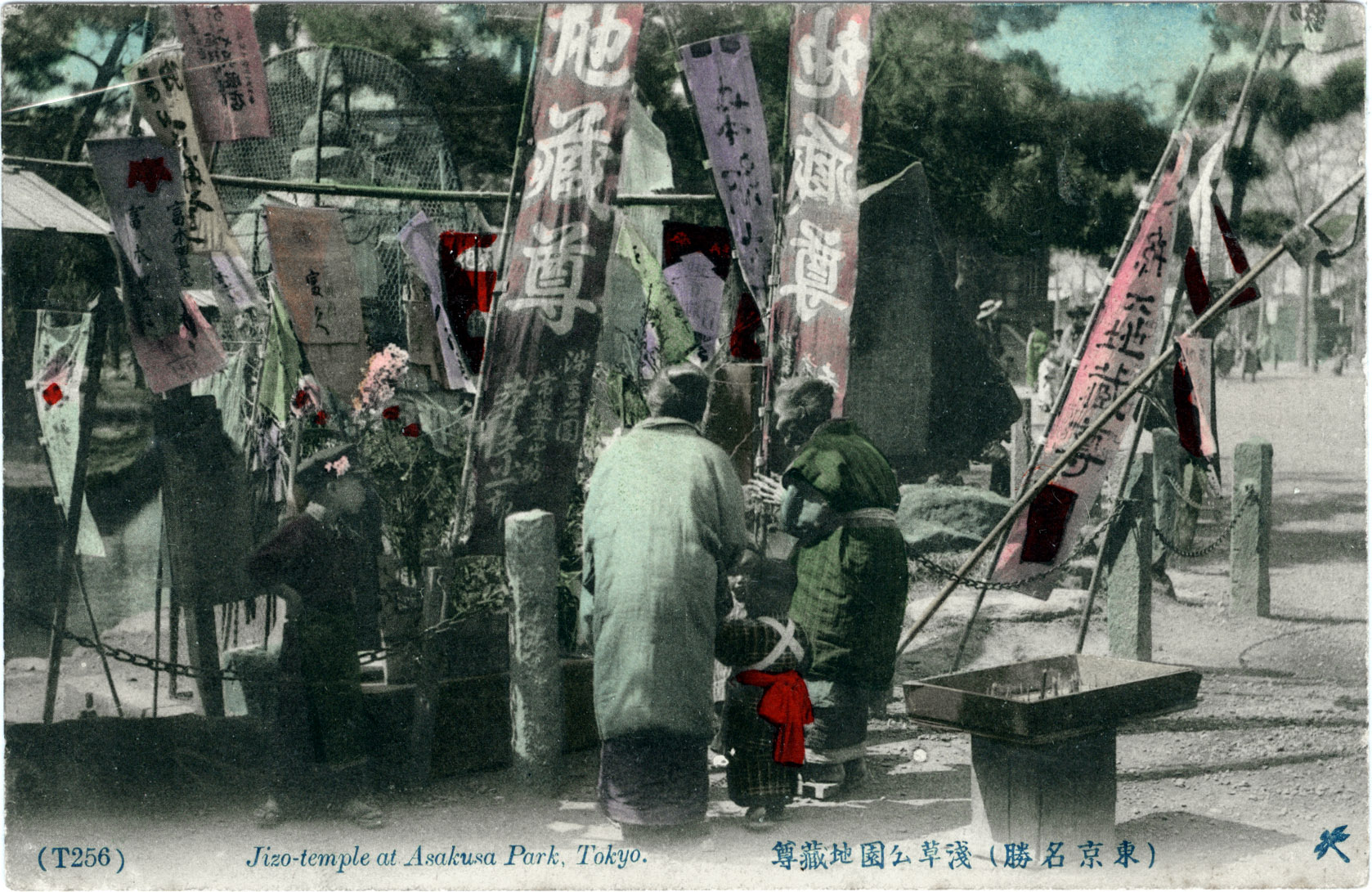“Statues of Jizo can sometimes be seen wearing tiny children’s clothing or bibs. Grieving parents place toys and other offerings beside the Jizo statue to invoke his protection of their dead child. Offerings are also made by parents to thank Jizo for saving their children from a serious illness. In the Edo period, when famine sometimes led the poverty-stricken to infanticide and abortion, the mizuko kuyō [fetus memorial service] ceremony was adapted to cover these situations as well.”