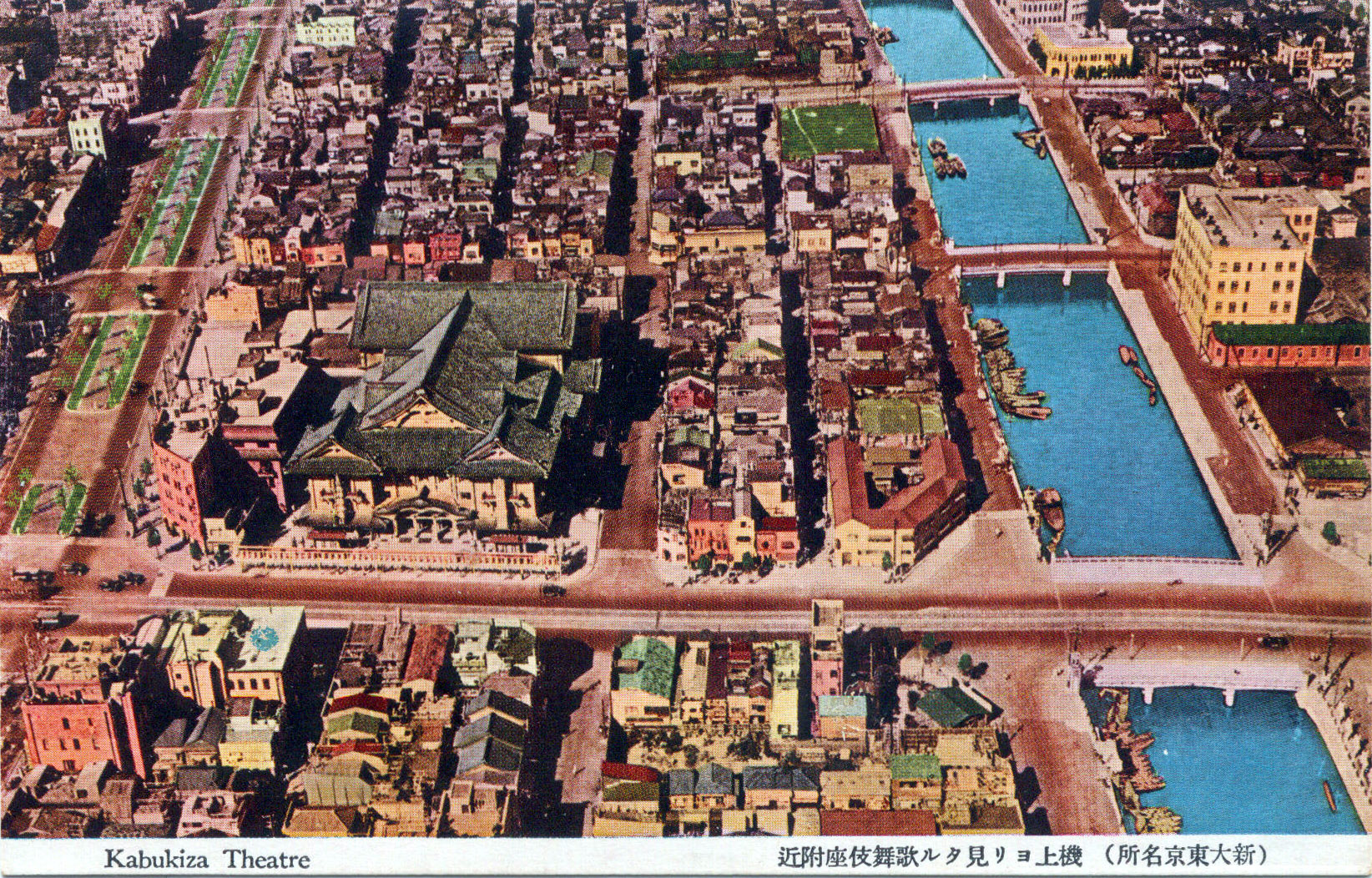 Kabuki-za, aerial view, Tokyo, c. 1940, showing its size relative to its Ginza neighborhood surroundings. The tree-lined avenue to its left is Showa-dori, a boulevard that was purposed to serve as a fire-break in the aftermath of the 1921 Great Kanto Earthquake.