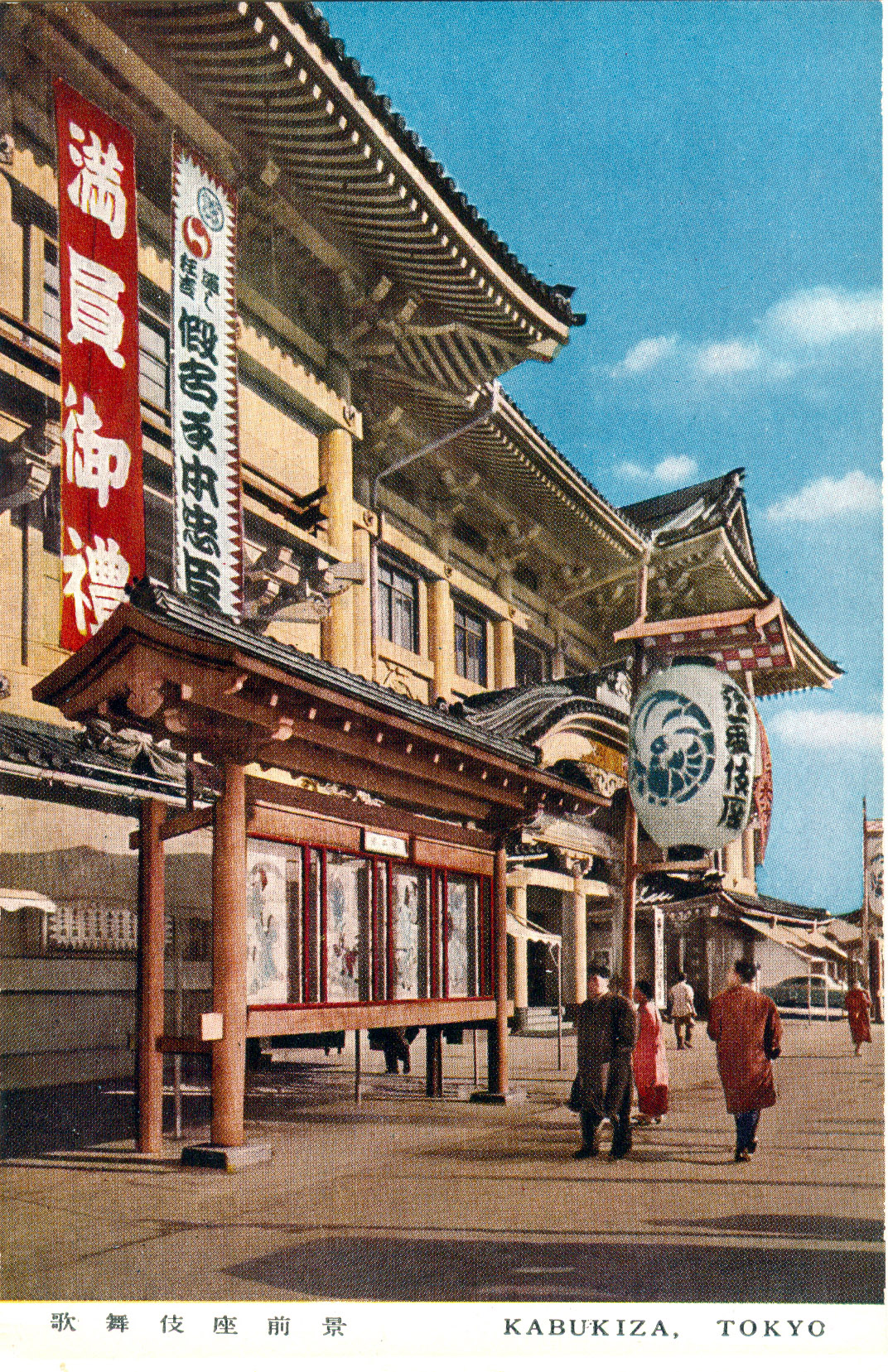 Kabuki-za, sidewalk view, Tokyo, c. 1960. Destroyed by wartime firebombing in May 1945, the theater was rebuilt to its prewar appearance and reopened in 1951.
