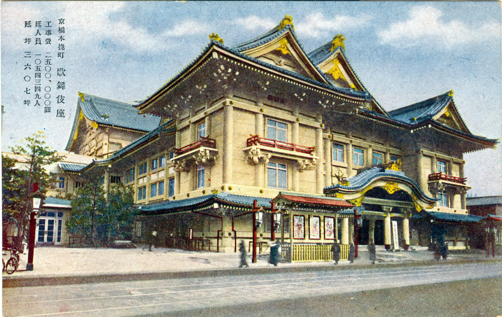 “A new Kabuki-za, the third, was being built on the site – this time in a Baroque-Japanese revivalist style (i.e., Wafu-Momoyama), meant to evoke the architectural details of Japanese castles, as well as temples of pre-Edo period. This theater, still under construction, was severely damaged by the 1923 Great Kanto earthquake. However, it was quickly repaired and was opened to the public in 1924.”