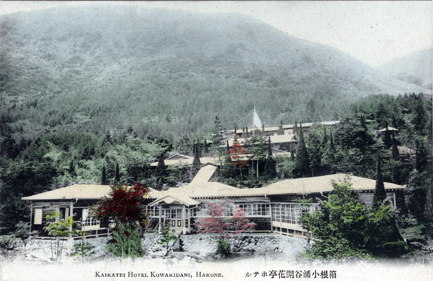 Kaikatei Hotel, Kowakidani, Hakone, c. 1910. Kowakidani is a district of Hakone nearby the more well-known Miyanoshita, and was once called “small hell” [小地獄, Kojigoku] for its rough terrain and multiple steam plumes rising up. It was renamed when the Emperor visited this spot in the Meiji period, and was later developed into a hot spring resort.
