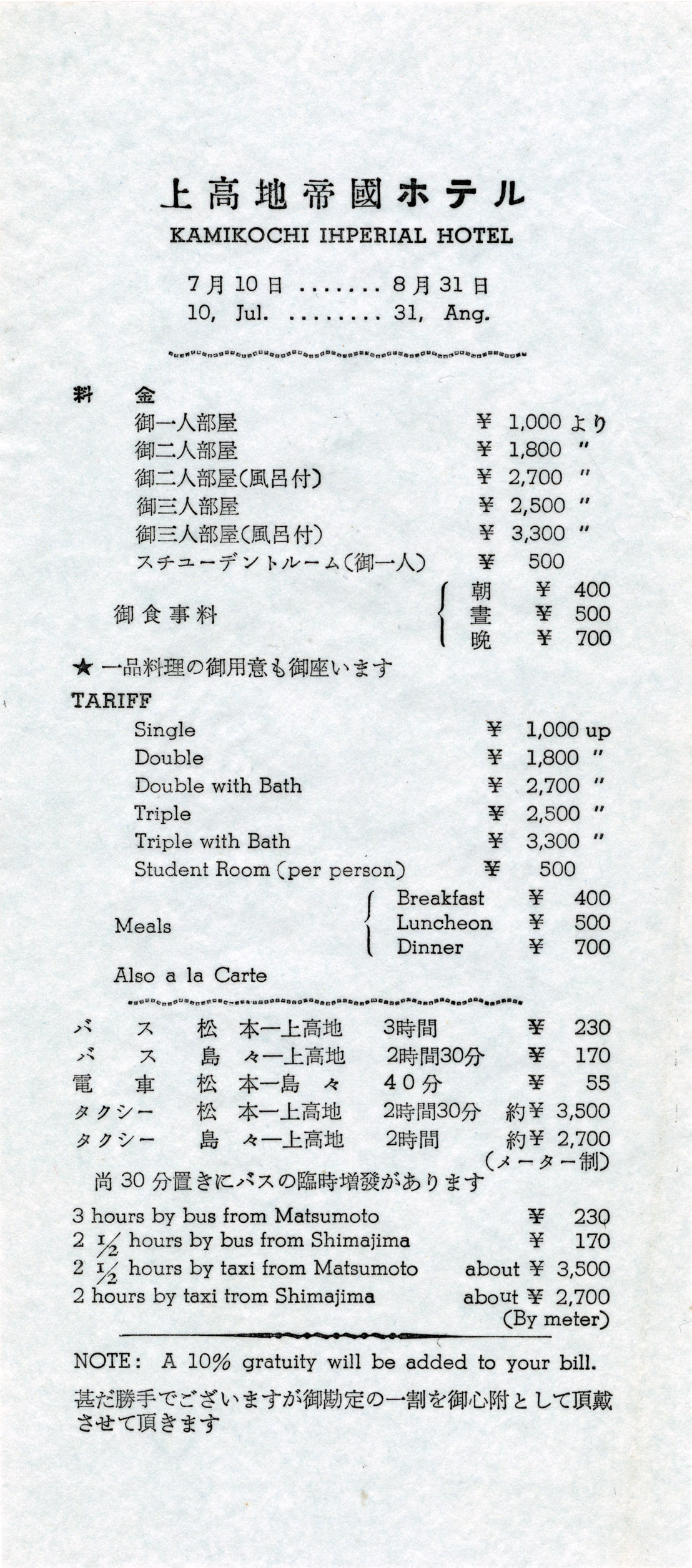 - Kamikochi Imperial Hotel, brochure, c. 1950.