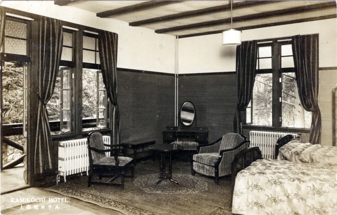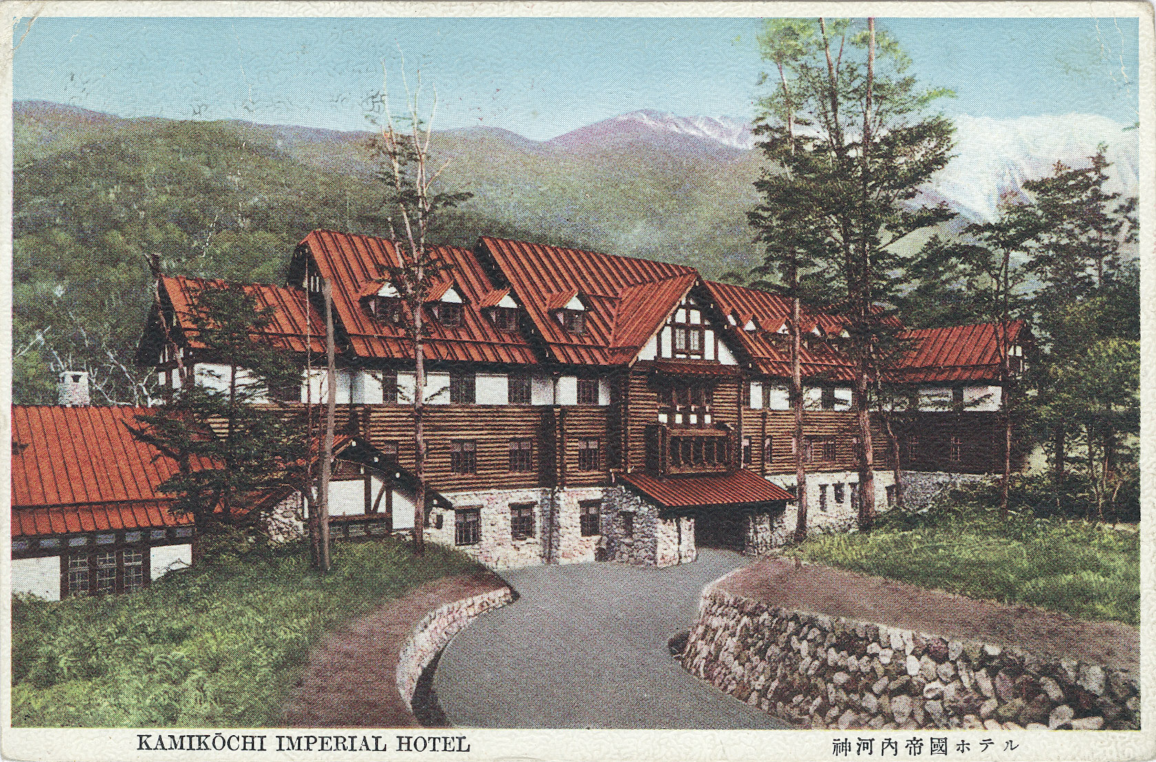 Kamikochi Imperial Hotel, Main Lodge, Matsumoto, c. 1940. The Kamikochi was Japan’s first mountain resort hotel when opened in 1933. It’s lodge-style lines were designed by Takahashi Teitaro who was responsible for the Shiba Park Hotel, the Kawana Hotel, and other notable hostelries.