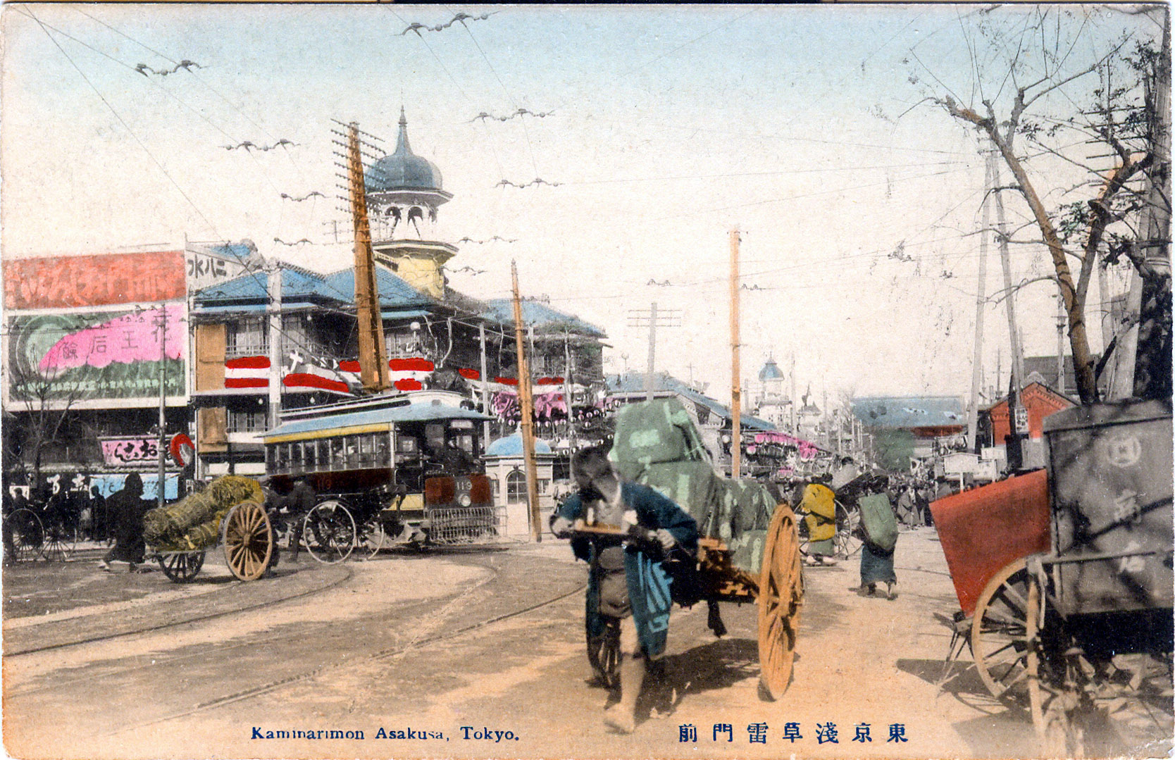 Kaminarimon, Asakusa, Tokyo, c. 1910. The avenue running perpendicular to the Nakamise arcade is known as Kaminarimon-dori. The outer gate leading into the Nakamise approach to the Asakusa Kannon had burned down in an 1865 fire and was not replaced until 1960.
