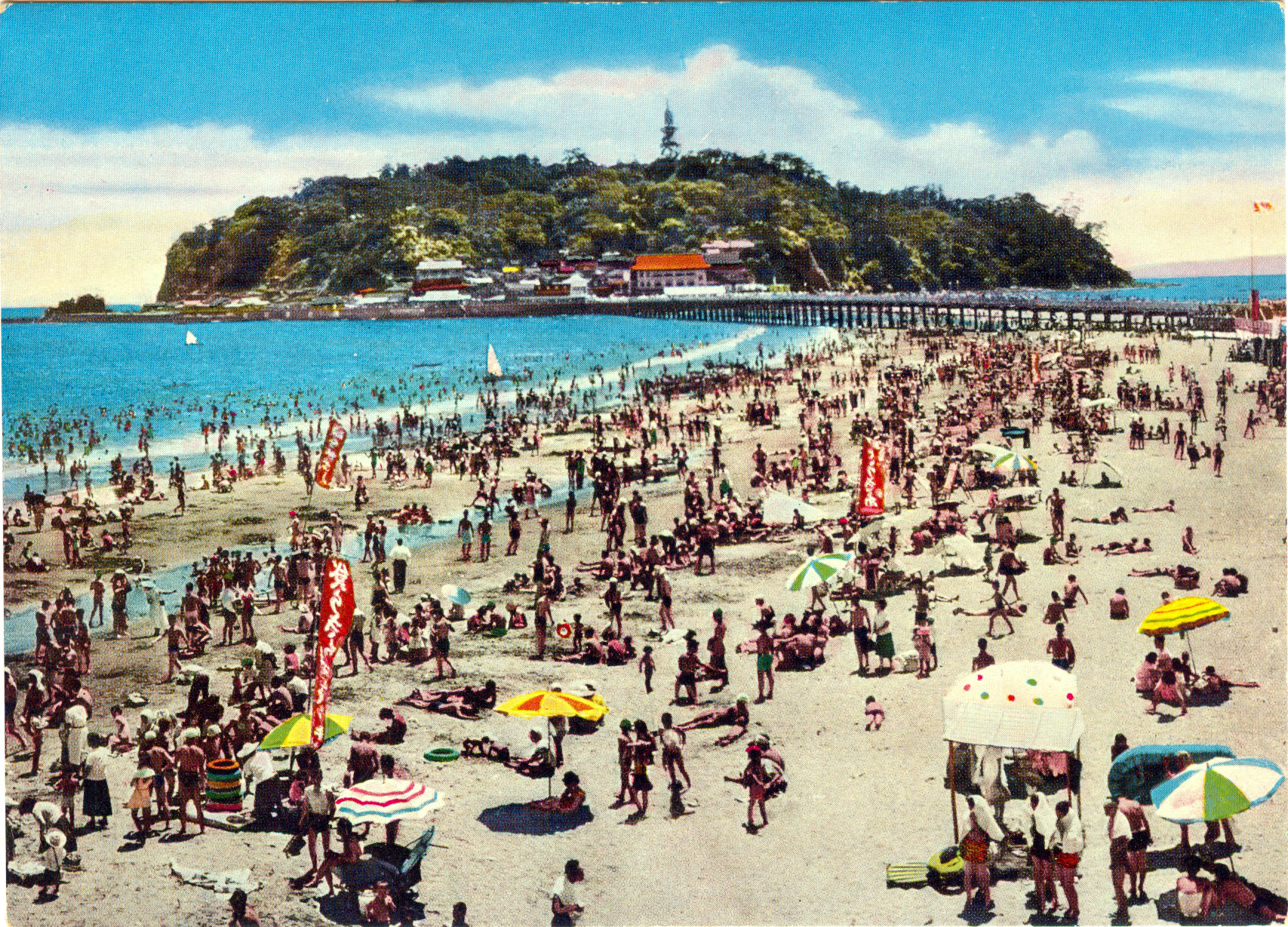 “… Katase Beach in Enoshima, a sandy beach 5 km long from east to west, is referred to as the Miami Beach of the Orient where fashionable bathing suits and colorful beach parasols prevail. You can enjoy sunbathing and happy summer memories here.”