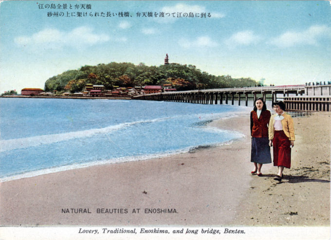 “Enoshima, with the glittering sea and upbeat atmosphere of Shonan, is currently popular for marine sports, such as yachting, surfing and beach volleyball. With its bathing beach and tourist spots, it attracts a great number of people from not only inside Kanagawa Prefecture, but also across the nation, every year.