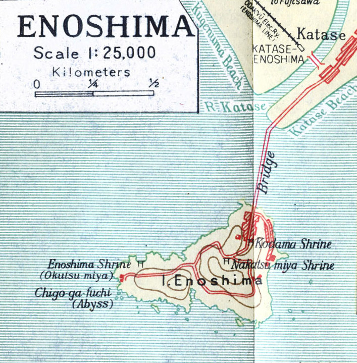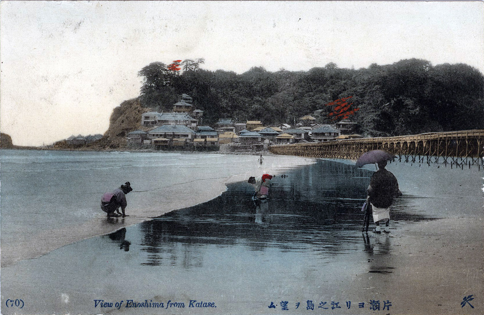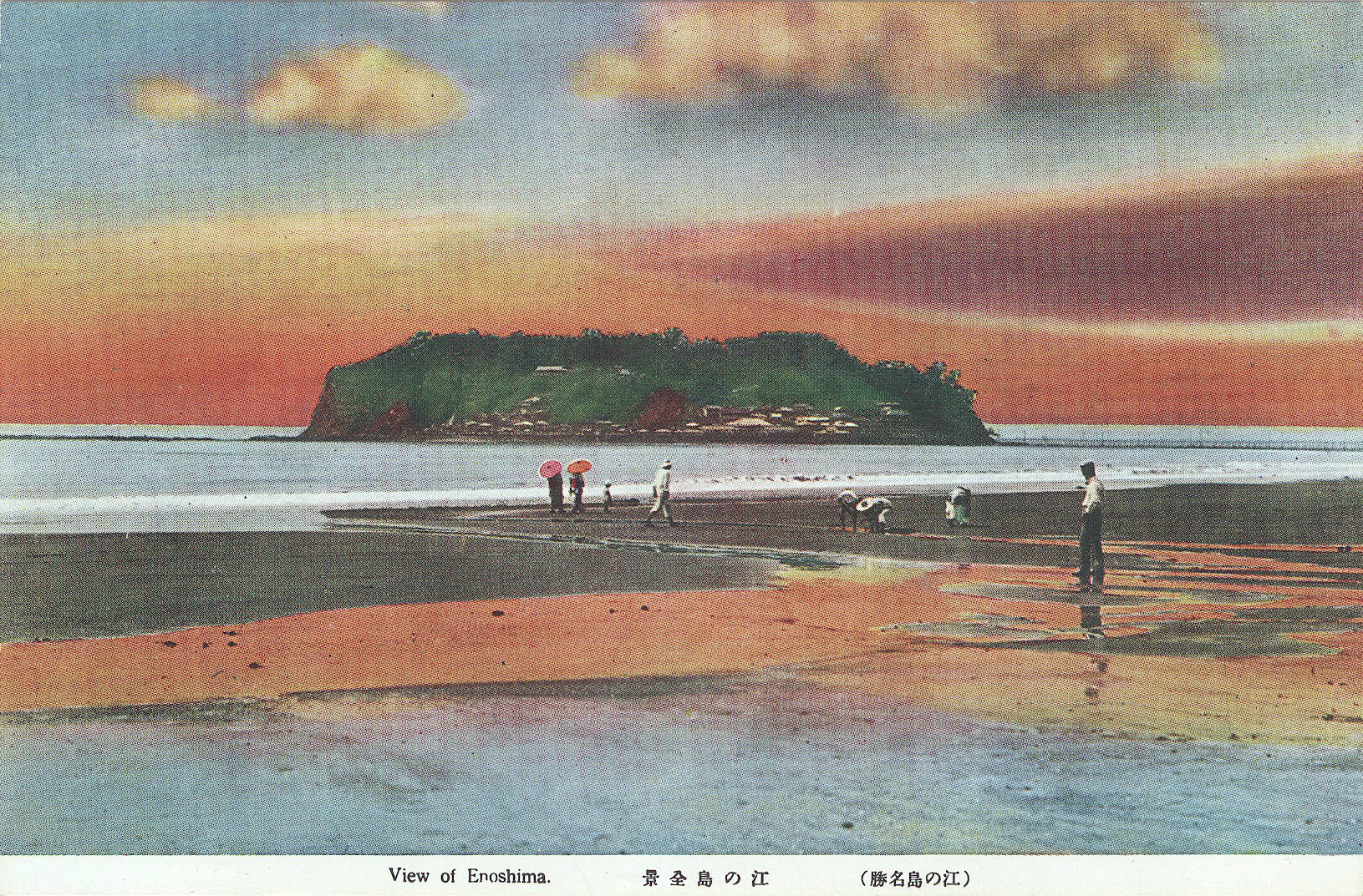 View of Enoshima from Katase, Enoshima, c. 1910, at low tide. Katase Beach is considered to be the oldest sea-bathing beach in Japan, first recommended in the 1870s for Western-style sea-bathing medical treatment by a German physician, Dr. Erwin von Balz.