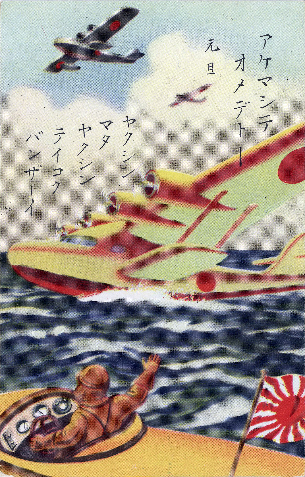 A Kawanishi flying boat decorates a New Year’s postcard, c. 1940. In addition to the traditional New Year’s greeting, Akemashite omedetou, there is also written: Yakushin mata / Yakushin teikoku / Banzai, roughly translating to “Making rapid progress toward the Imperial empire”. The flying boat was the principal type of aircraft used to connect the South Seas mandates to the Home Islands due to the shortage of flat land available for airfields. Imperial Japanese Airways began some commercial flights in 1935; regular commercial flights were begun in 1940 and a regular service commenced in 1941.