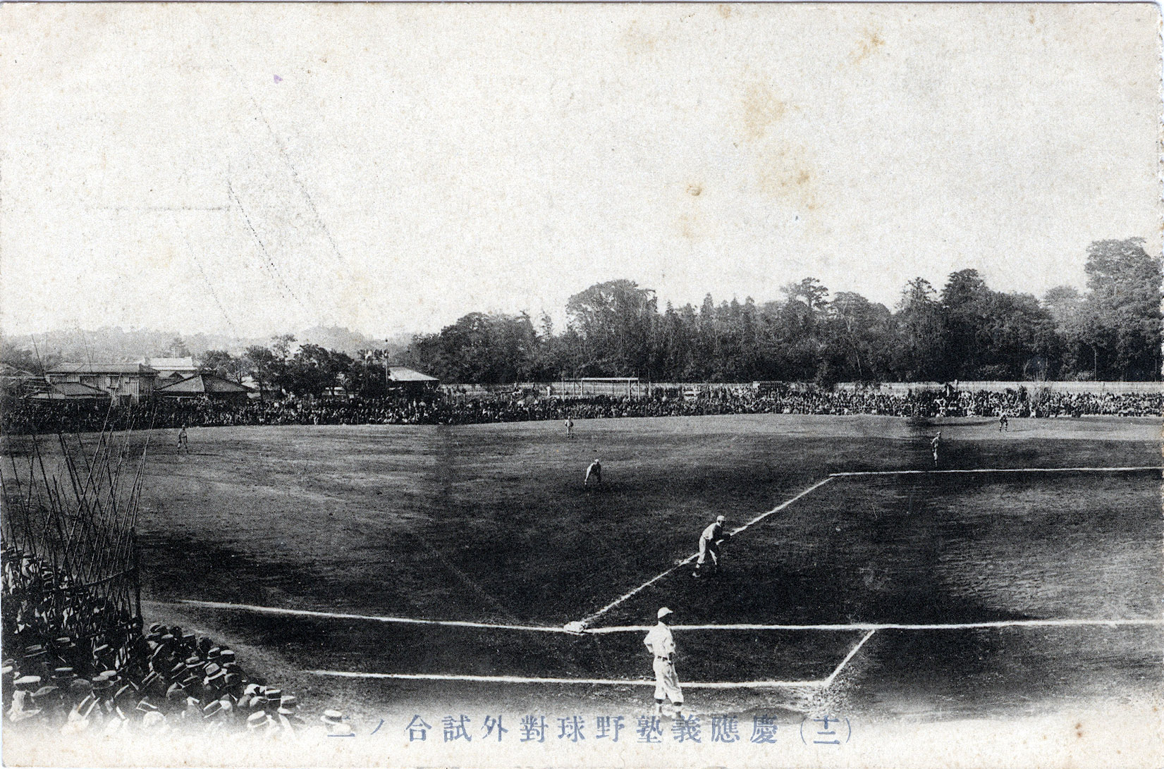 Keio University baseball players on the field, c. 1910. Caption reads “Keio University baseball games against other teams.” A fierce rivalry, the Sokeisen, developed between the Keio University and Waseda University baseball teams, so much so that competition between the two teams was suspended in 1906 until resumed in 1925. The final Waseda-Keio Sokeisen was a ‘send-off’ game on October 16, 1943, at the Totsuka Stadium of Waseda University, preceding the mobilization of university students, previously exempt from induction, to war service.