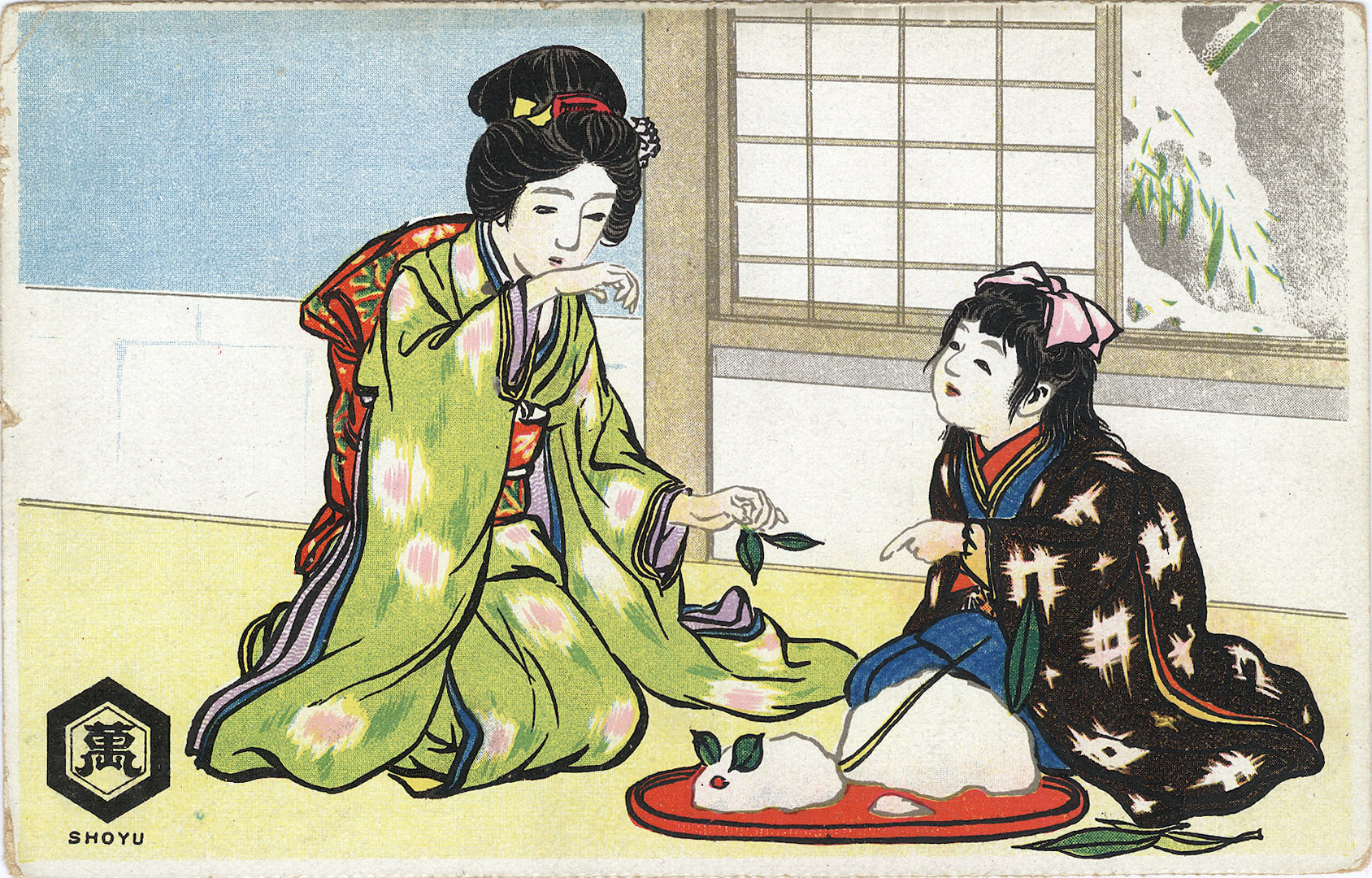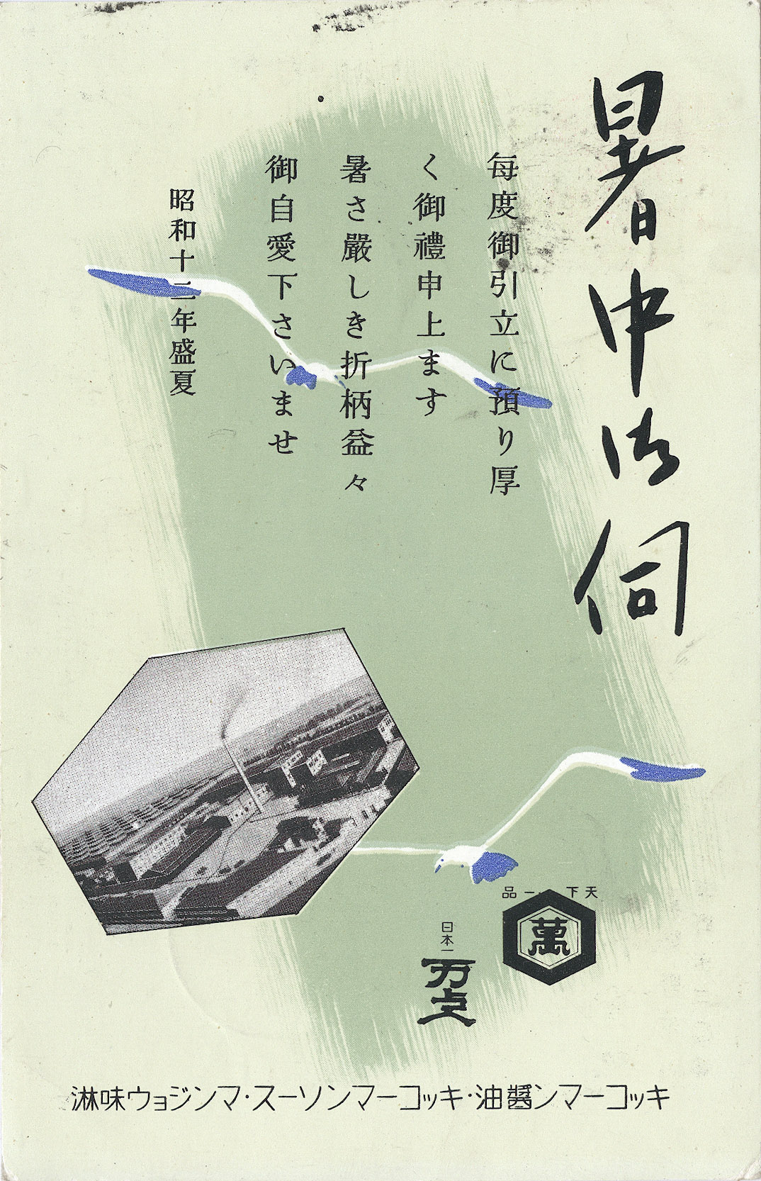 A New Years postcard from Noda Shoyu Brewing Co., 1937, highlighting the company’s three products: Kikkoman shoyu (soy sauce), Kikkoman Sauce (a thick, sweet sauce), and Kikkoman mirin (sweetened rice wine). The caption reads: “Thank you for your continued patronage / It has been a hot and humid season / Please take care of yourself”.