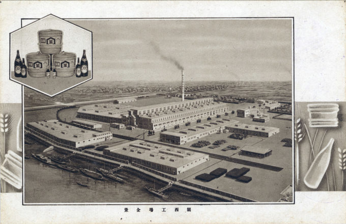 An aerial view of Kikkoman’s Kakogawa shoyu factory and administrative building at Takasago, Osaka, c. 1930. Shoyu (soy sauce) is made from four basic ingredients: soybeans, wheat, salt and water. A proprietary form of koji mold, Kikkoman aspergillus, is then added in the Kikkoman-branded fermentation process.