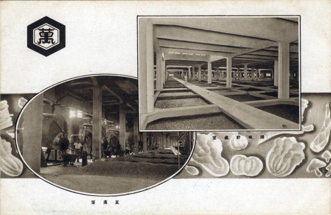 - Kikkoman’s Kakogawa shoyu factory at Takasago, Osaka, c. 1930. Steamed soy beans are mixed with crushed, roasted wheat into a paste with koji starter (left). The moromi mash is then aged and fermented for several months in large pools (right).
