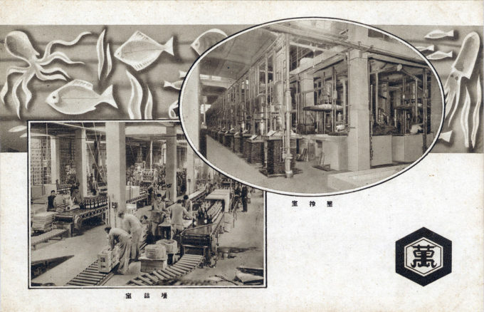 - Kikkoman’s Kakogawa shoyu factory at Takasago, Osaka, c. 1930. The moromi is mechanically pressed and sauce extracted from the mash (right). Then, after clarification and heating to stop fermentation, the soy sauce is bottled and labeled (left) for distribution and sale.