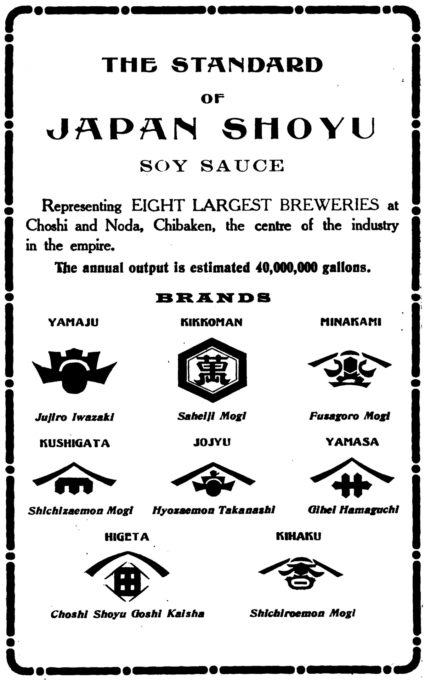 Chiba Prefecture shoyu manufacturers advertisement, 1915, including Mogi Cos.’s “Kikkoman” brand. [Source: Japan and Her Exhibits at the Panama-Pacific International Exhibition souvenir booklet]