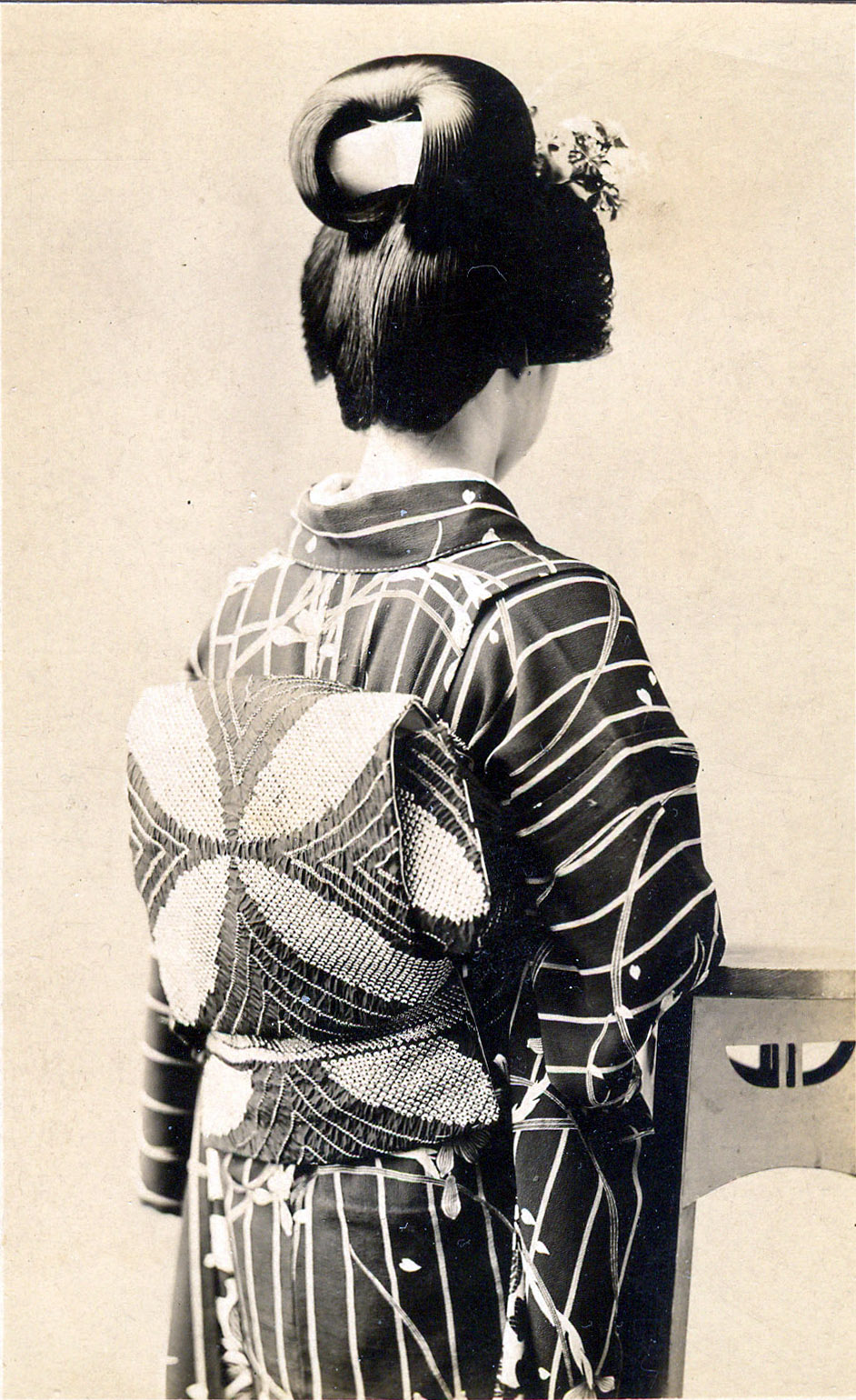 “The obi is a sash which holds the kimono together, as that garment is innocent of buttons or other means of fastening. A woman’s obi is about a 2 feet wide, folded double, and about 11 feet long, being wound round the waist two times and tied in a bow behind. The kimono and obi are two different things, but in use they are really one and inseparable. When we speak, therefore, ofthe kimono, we quite naturally include the obi in our thought.