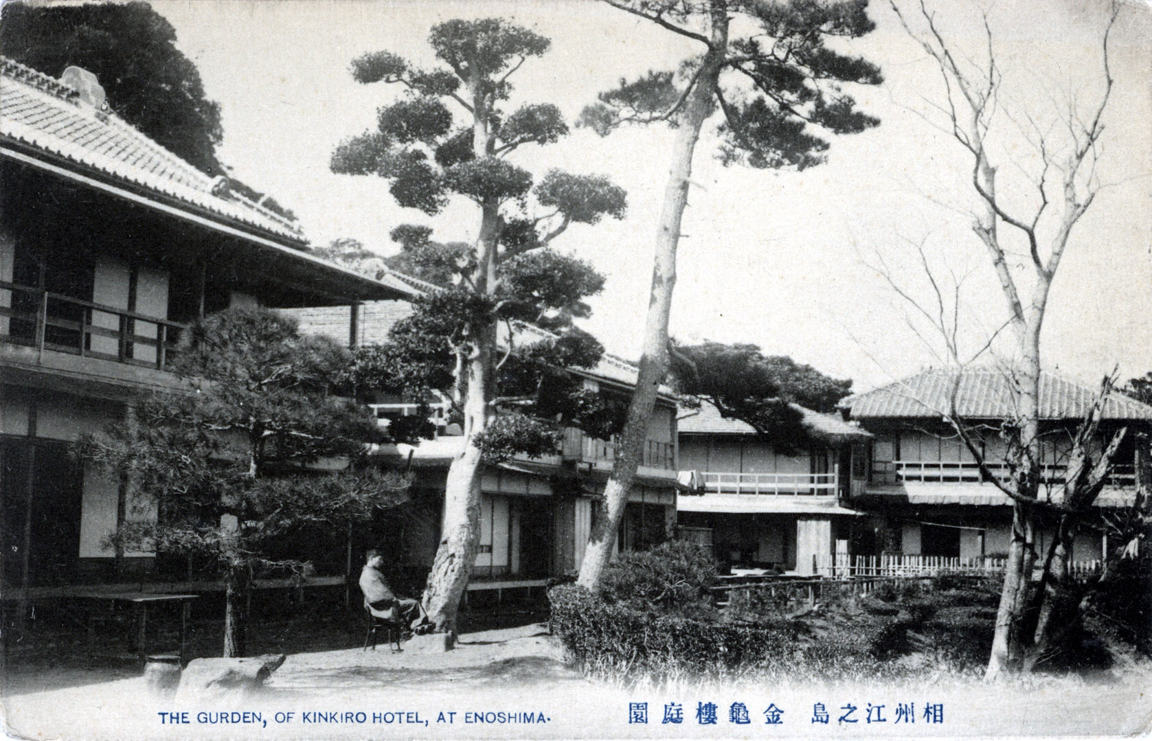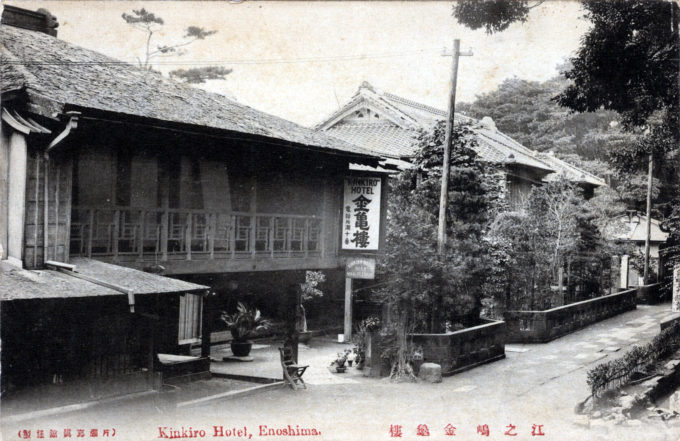 “Kinkiro Hotel, Enoshima: This first-class and commodious Hotel is situated at the highest point of the Picturesque island of Enoshima and commands a magnificent view of the sea and surrounding country.