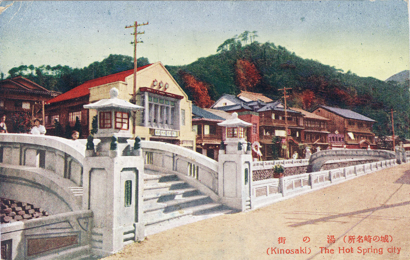 “Kinosaki, the Hot Spring city”, c. 1920. Kinosaki is located in northern Hyogo Prefecture on the coast of the Sea of Japan, app. 50-miles east of Tottori. Hot springs were discovered in Kinosaki around the 8th century, and the city is still considered to be one of the top onsen destinations of the Kansai Region.