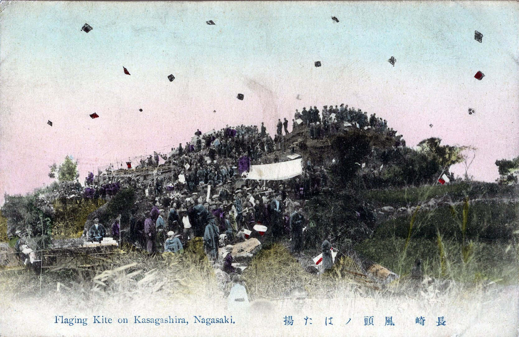 “Flaging [sic] kite on Kasagashira”, Nagasaki, c. 1910. A Japanese dictionary dated 981 AD was the first to record the Japanese word for kite and used the characters for kami tobi, meaning paper hawk – which suggests that the first kites were bird shaped.
