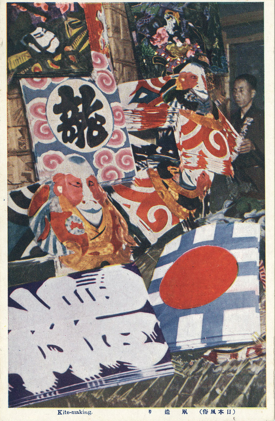 Kite maker, c. 1930. There are about 130 different styles and types of kites in Japan, each region having its own unique shape. All are painted with bright-colored natural dyes, sumi (black ink) and constructed from washi paper (handmade rice paper) and bamboo – or where bamboo is difficult to grow, cypress wood is used instead. The framing is called the ‘bones’ and the paper covering is known as the ‘skin’.