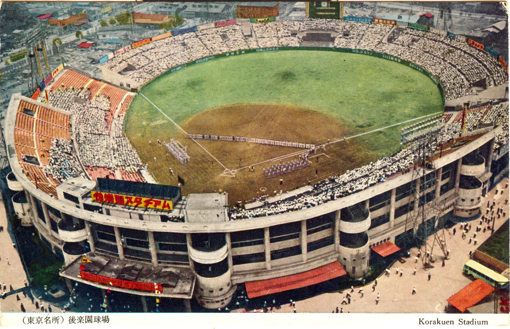 Korakuen Stadium, Tokyo, c. 1960, with the stands full of spectators for the annual National Intercity Amateur [Baseball] Tournament hosted at Korakuen Stadium, best known as the home field of Japan’s perennial professional baseball champions, the Yomiuri Giants.