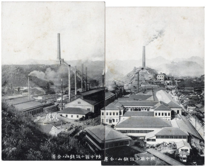 Kosaka Copper Mine, Kosaka, Akita Prefecture, panoramic duo-postcard, c. 1920, became one of the most productive copper mines in Japan after its opening in 1816 during the late Tokugawa period. Its deposit of kuroko [black ore] was the largest of its kind in the country.