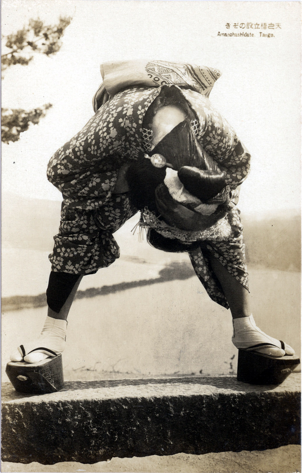 Viewing Ama-no-hashidate, c. 1920. “If you bend over and try to look at the view through your legs, it is said that Ama-no-hashidate will appear like a bridge to the heavens.”