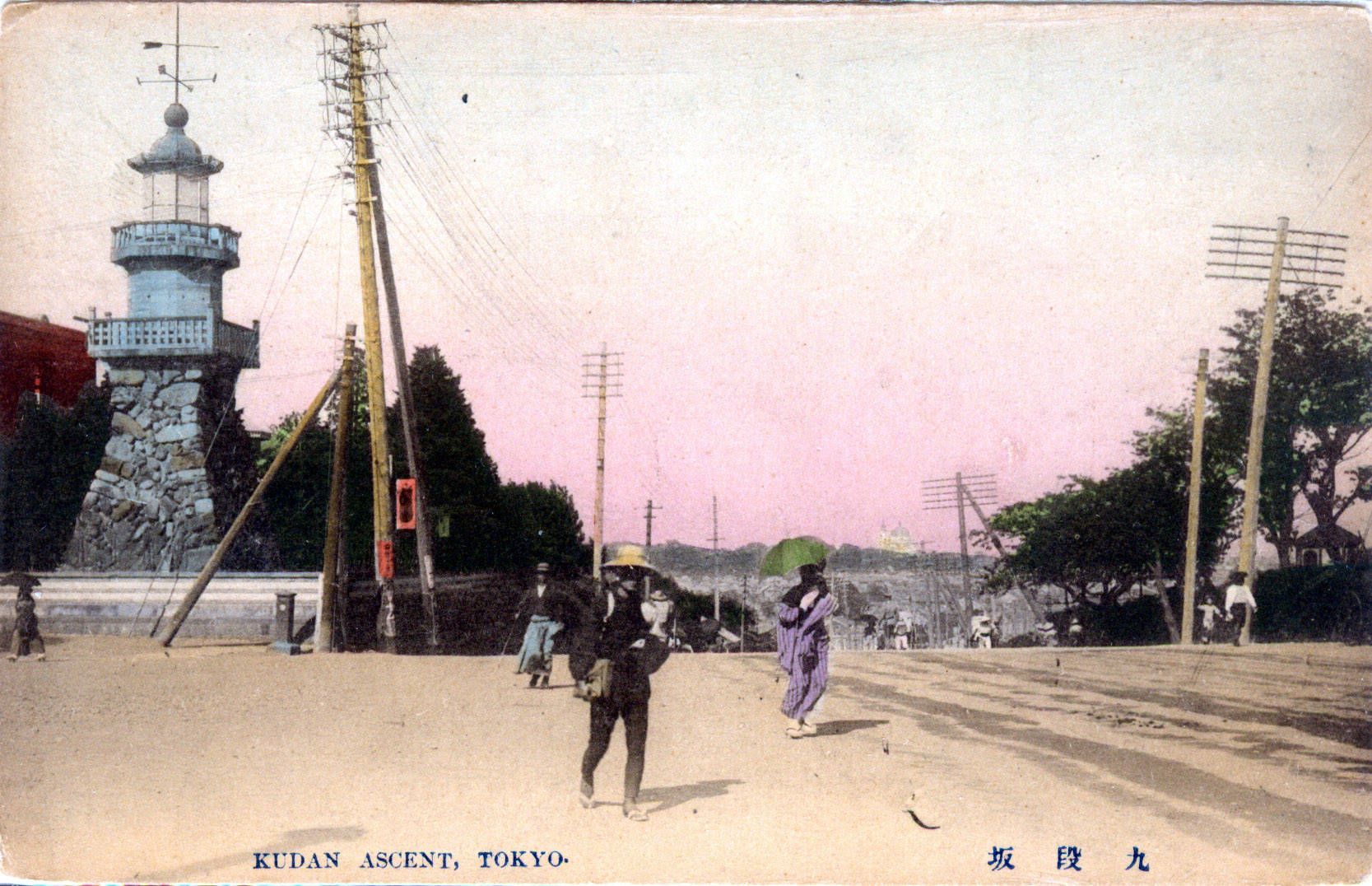 Kudan Ascent, Tokyo, c. 1910. Looking east from the summit, toward Ochanomizu. At left is the toudai (lighthouse) built in 1871. In the distance, faintly right of center, can be seen the dome of the Nikolai Russian Orthodox Cathedral at Ochanomizu.