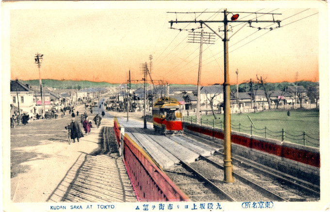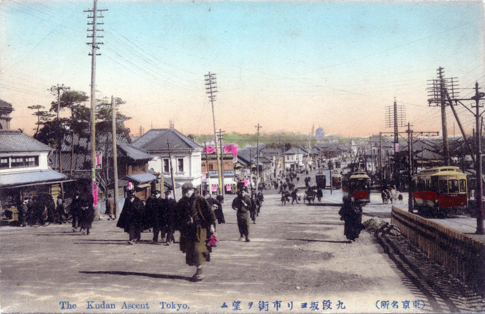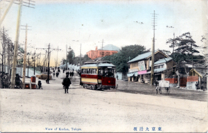 - A streetcar ascends Kudan Hill. At center can be seen the Kaikosha and lighthouse atop Kudanzaka, c. 1910.