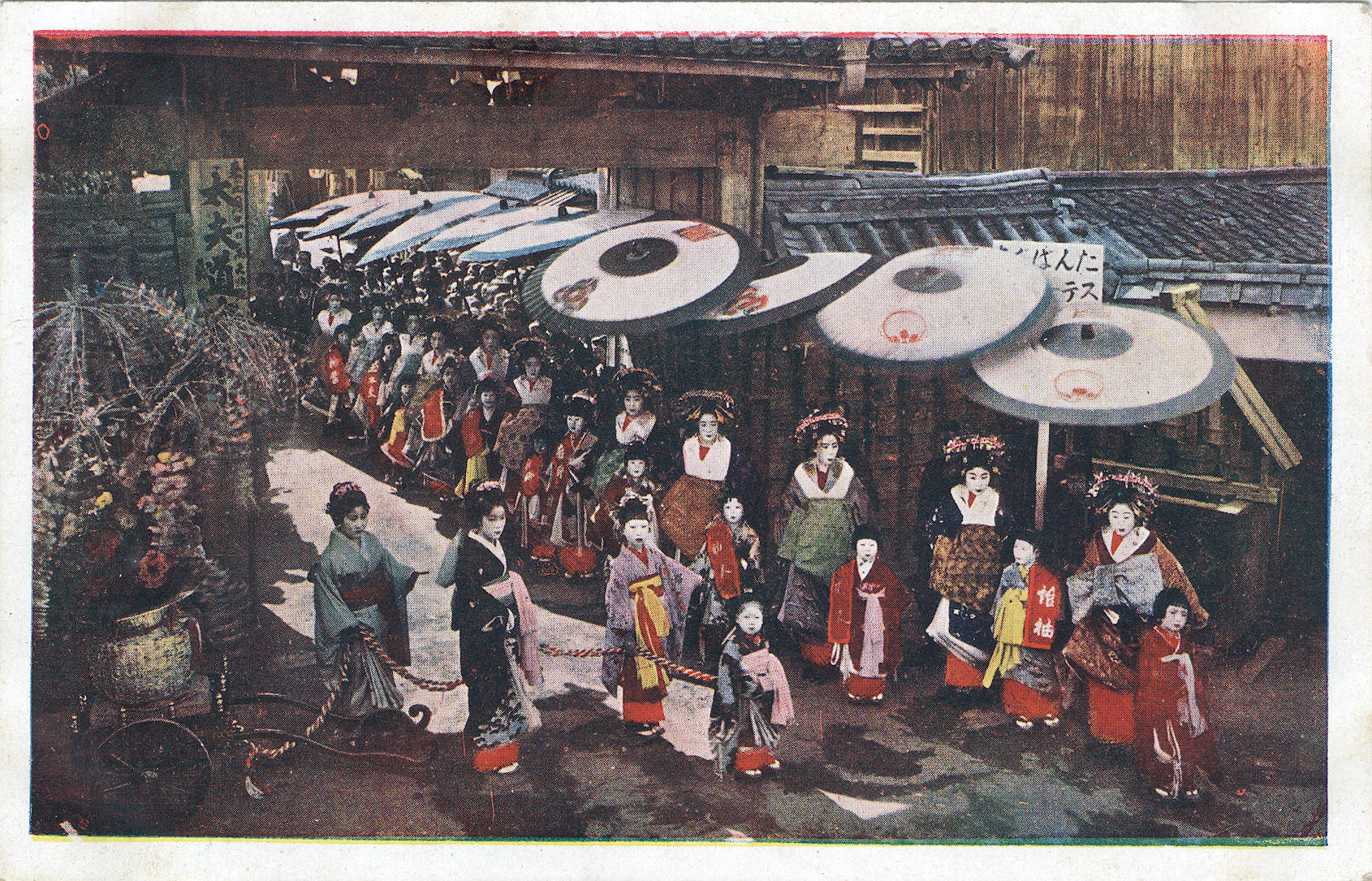 “Kyoto Tayū dochu”. Procession of tayū and kamuro (child attendants) through the “flower town” (hanamichi) licensed quarter, Kyoto, c. 1920. Tayū were the premiere courtesans, learning the arts of the nobility while geisha learned the arts of the common people. During this famous annual late-April parade, tayū wore their finest kimono, and walked on 8-inch high three-toothed black lacquered wooden geta (koma geta) accompanied by their young attendant apprentices.