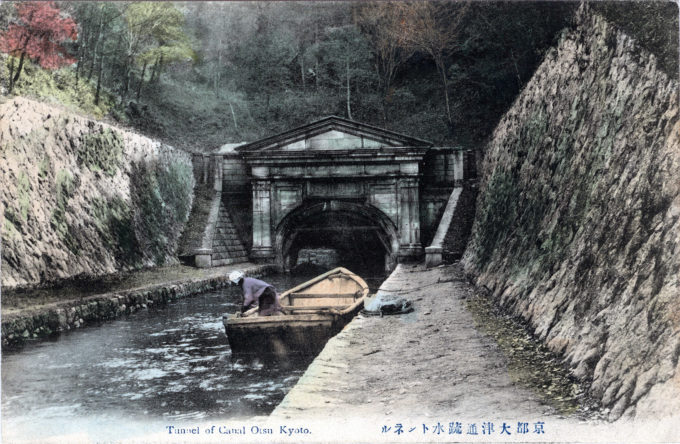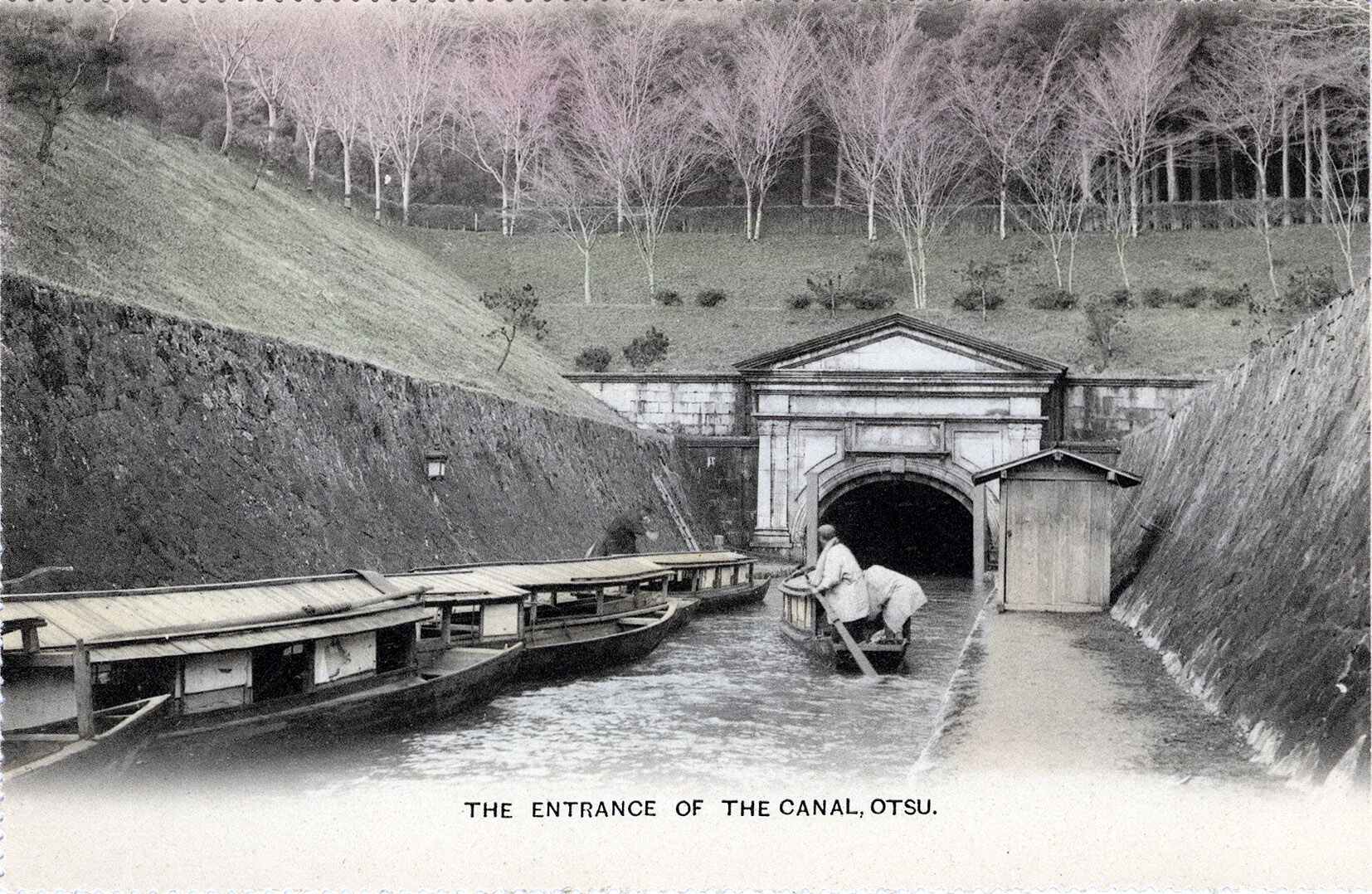 “The entrance of the canal”, Otsu, Kyoto, c. 1920. The Lake Biwa Canal was constructed during the Meiji era of modernization to transport water, freight, and passengers from Lake Biwa to the nearby city of Kyoto. The canal waters also supplied Japan’s first public hydroelectric power generator, beginning in 1895, that provided electricity for Kyoto’s trams. In 1996 the canal was designated an Historic Site.