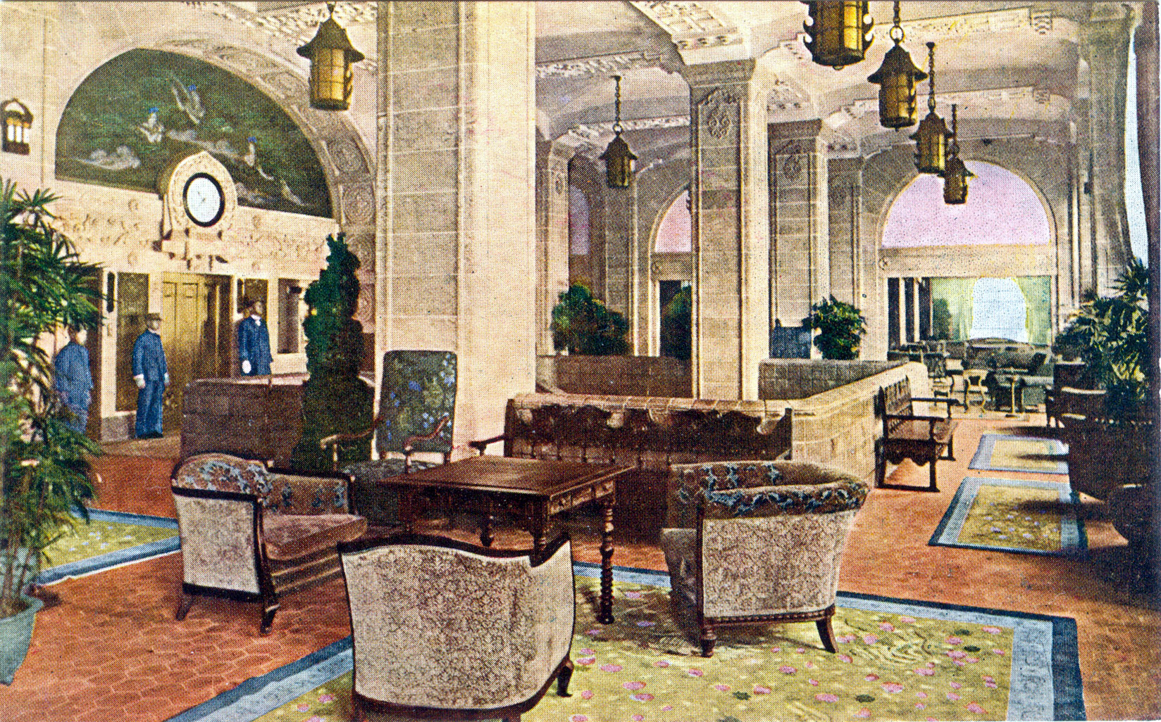 The Hotel New Grand was opened in 1927 to replace the “old” Grand Hotel destroyed by the 1923 Great Kanto Earthquake. The hotel was located along the waterfront Yokohama Bund, near the passenger-liner dock and served a largely foreign and overseas business clientele. Note the elevator attendants at second-floor Grand Entrance.