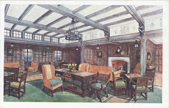 M.S. Asama Maru, smoking room, c. 1930, ‘in the style of the early Tudor period. Mah jong sets and requisites for various other games are provided for general use.’