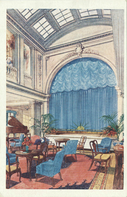 M.S. Asama Maru, lounge, c. 1930, ‘decorated in the Georgian style. Convertible into a Grand Ball-room. A regular stage is provided for cinema shows and other performances.’
