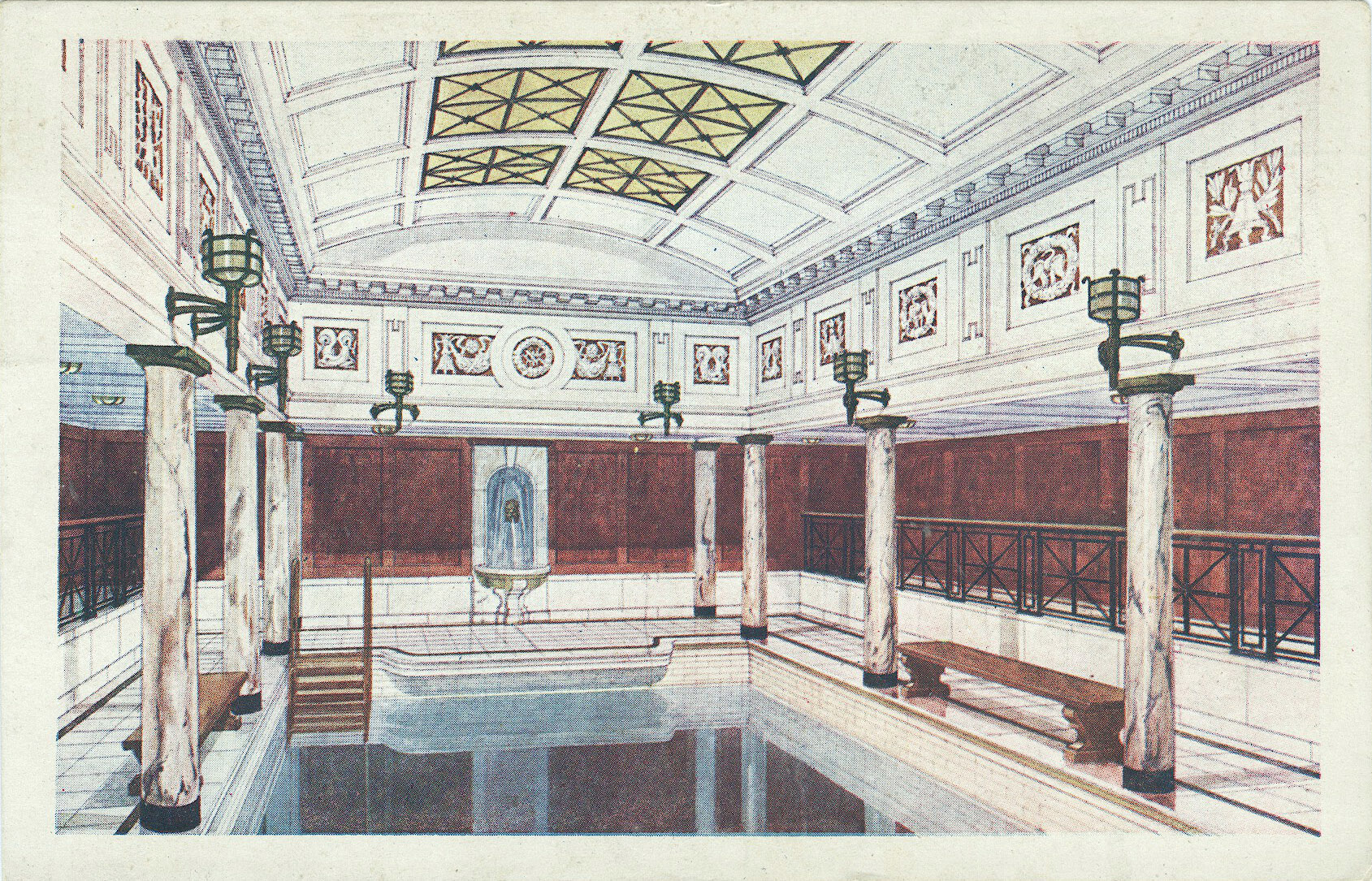 M.S. Asama Maru, swimming pool, c. 1930, ‘constructed in Roman style. Dressing cubicles, fresh water shower-bath, and drying room are attached.’