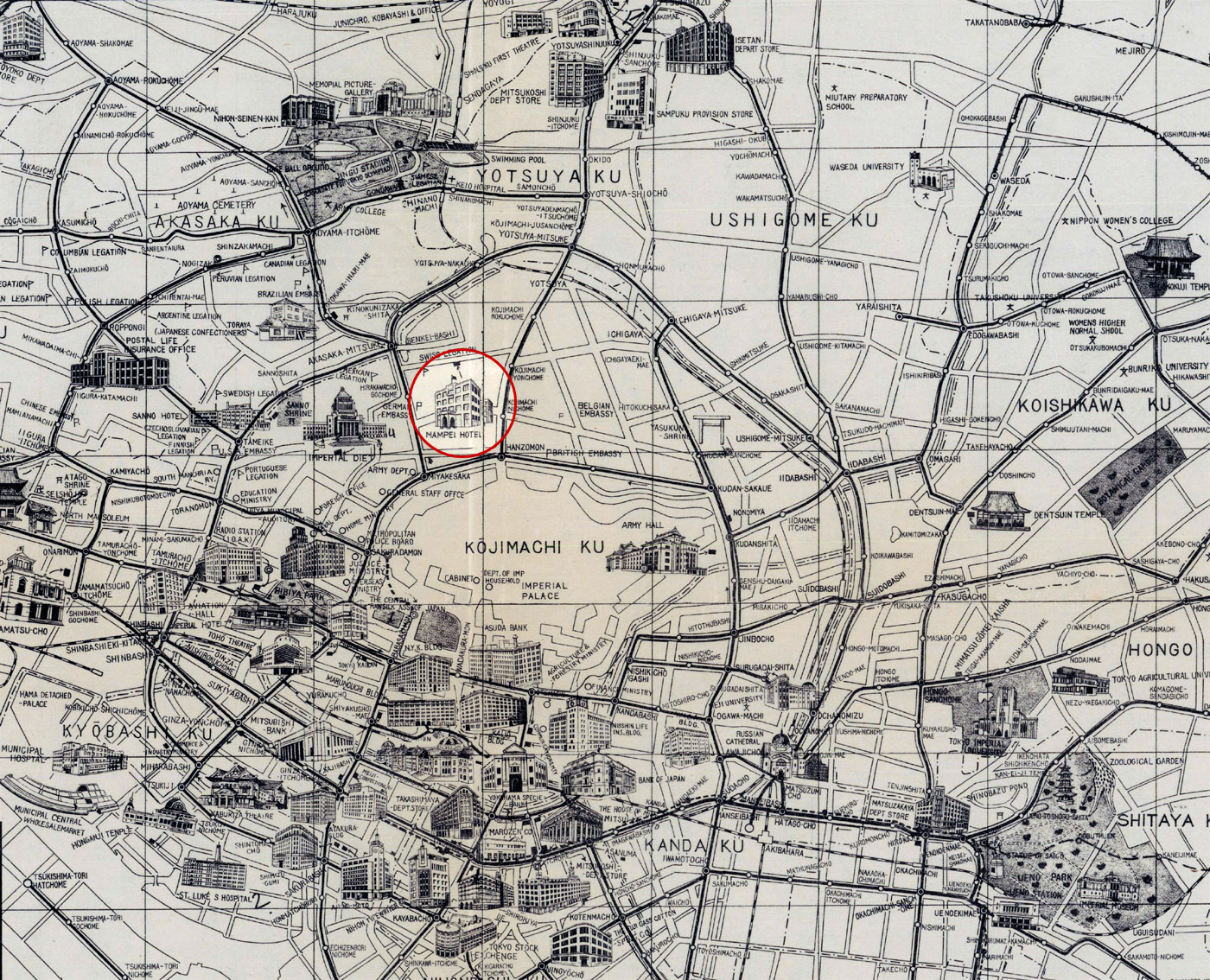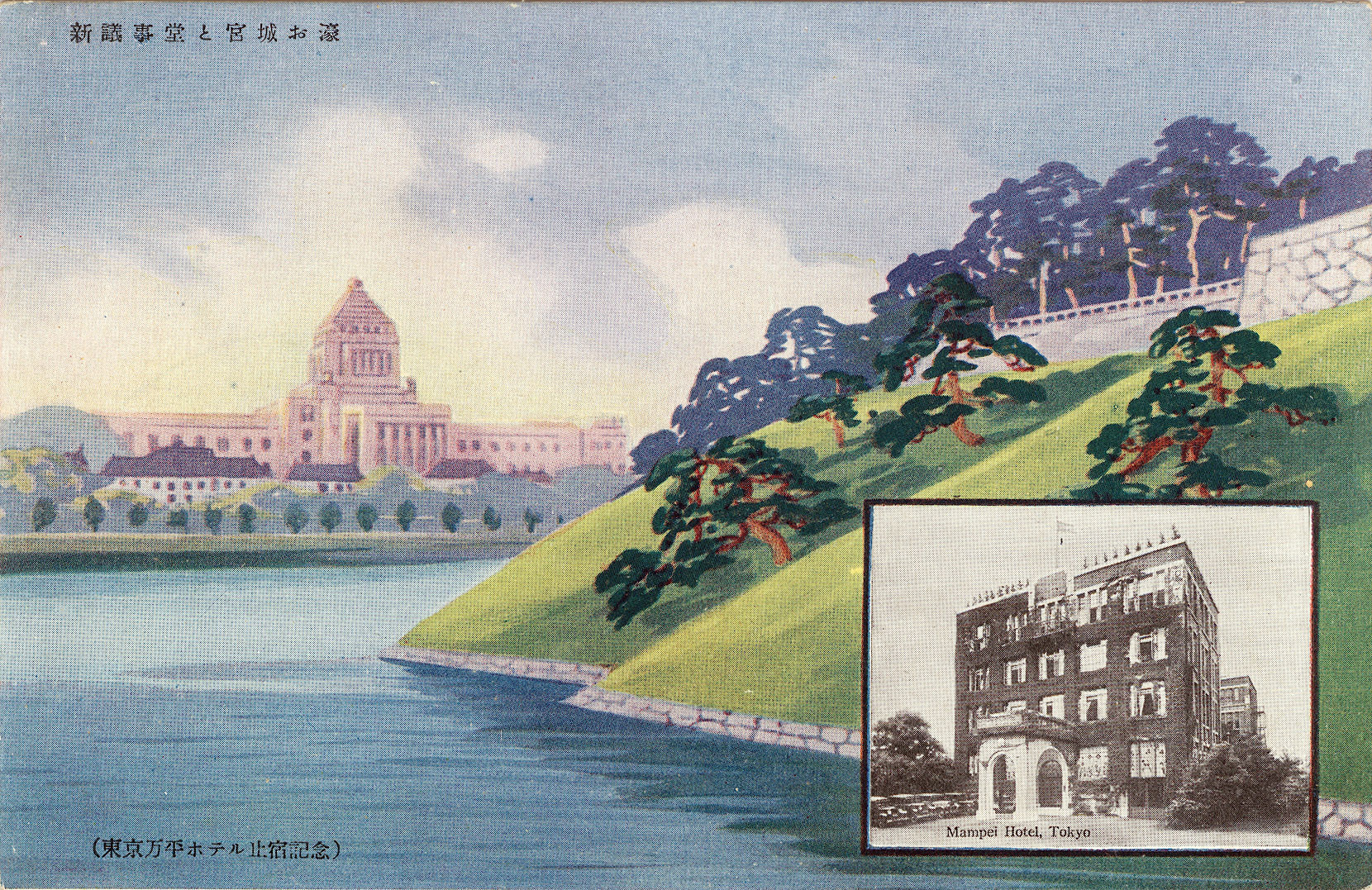 Mampei Hotel, Tokyo, c. 1940. As with the illustrated Imperial Diet, the hotel (inset) shared a view of the Imperial Palace across the moat from the Hanzomon gate. It was located across the street from the German embassy.