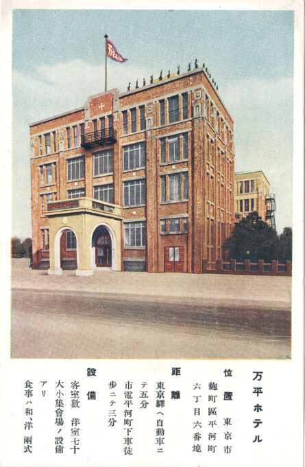 The Tokyo Mampei Hotel branch opened in 1932, one of four new branches opened by the “International Sightseeing Hotels, Ltd.” to expand the prestigious Mampei brand to Atami (in 1927), Tokyo (1932), Yashima (1932), and Nagoya (1933).