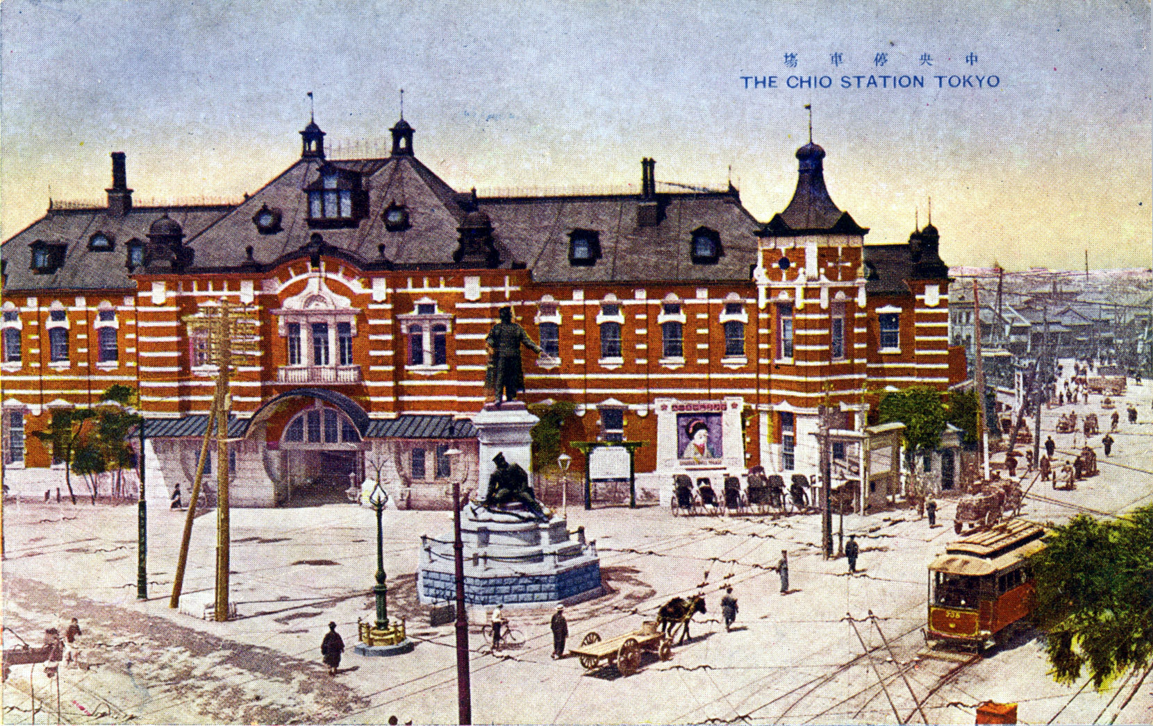 “The new Manseibashi terminus of the Central Rly [Chuuo-sen], which comes to this point through Kanda and other wards, [is] in the Renaissance style, contains 2 million bricks, 20,000 granite blocks, 180 tons of steel, and considerable marble and bronze, and was completed after designs by Prof. Tatsuno in 1912 at a cost of ¥300,000.