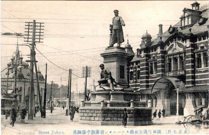 Manseibashi Station, c. 1915, the grand terminus (1912-1919) of the Chuo Line, with the bronze monument honoring Russo-Japanese War hero Commander Hirose sited on its plaza.