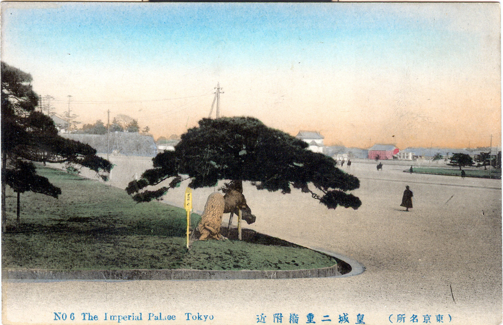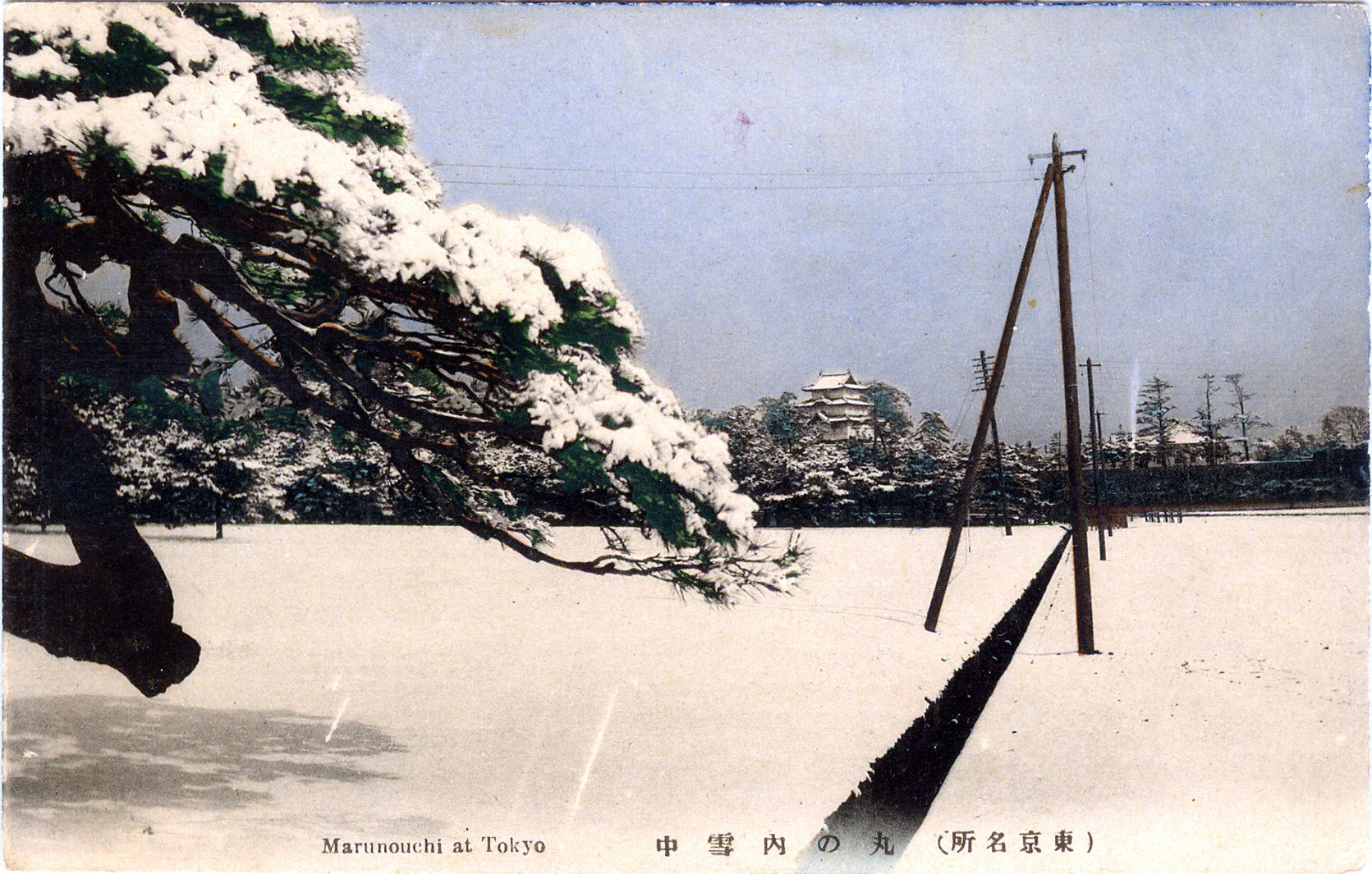 Marunouchi at Tokyo, c. 1910. Looking across the Imperial Palace plaza toward the then-vacant Marunouchi district. Fujimi Yagura, one of the three remaining castle keeps leading to the inner citadel of Edo Castle, can be seen in the distance.