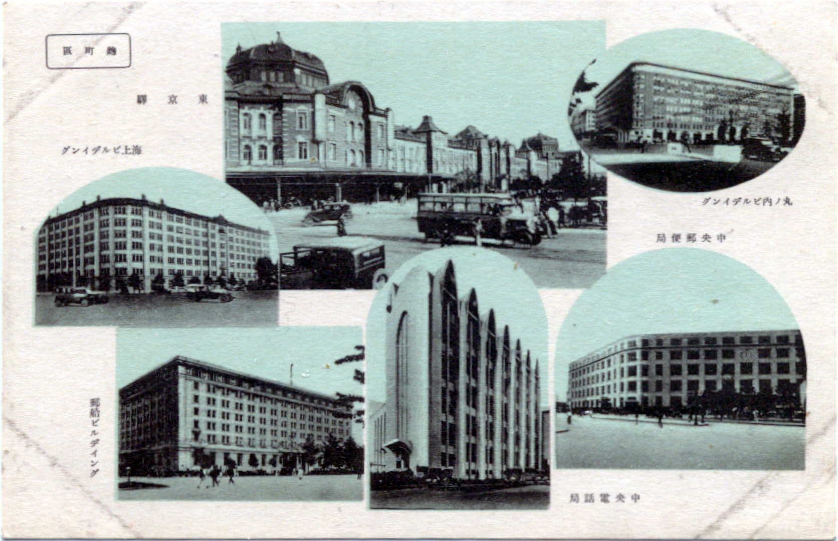 Miscellaneous buildings in the Marunouchi business district, c. 1930. Clockwise from top: Tokyo Central Station, Marunouchi Building, Central Post Office, Central Telephone Office, Yusen (NYK) Building, Kaijo Building.