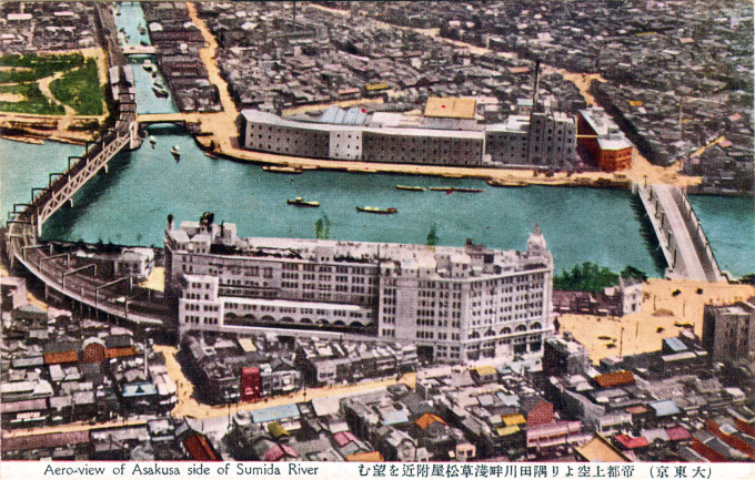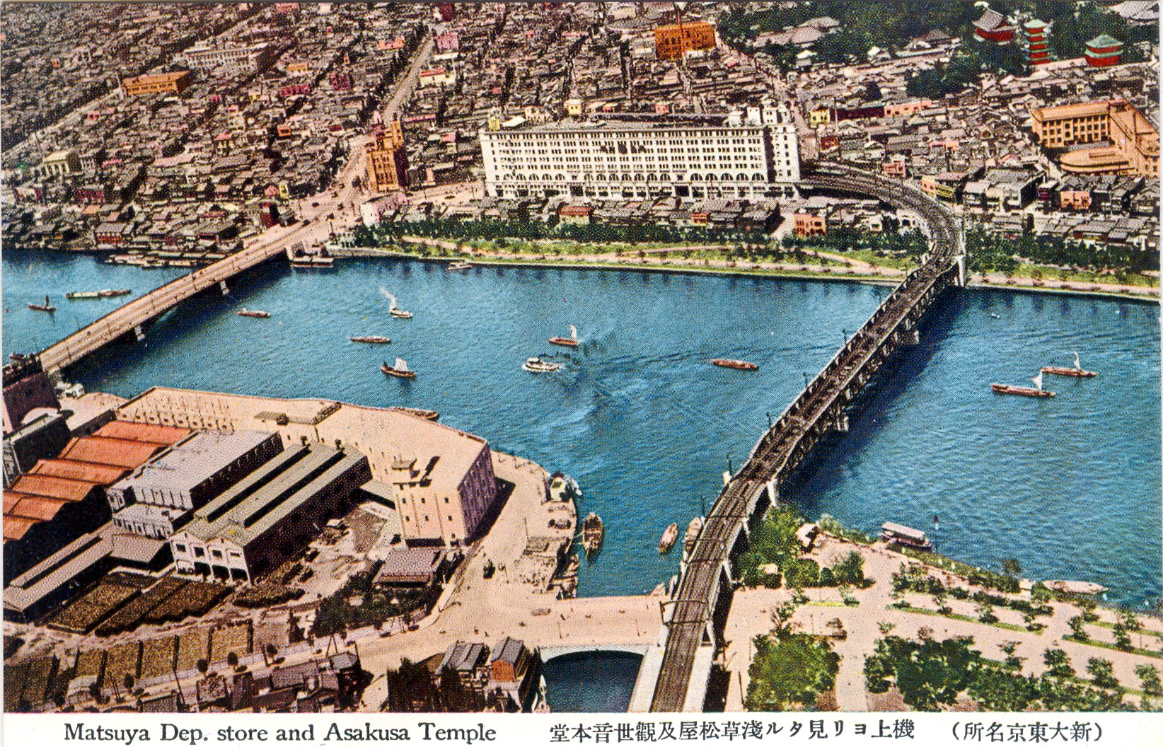 - Aerial view of Matsuya Asakusa and the Asahi Brewing Co., c. 1940. The Tobu railway bridge is at left.